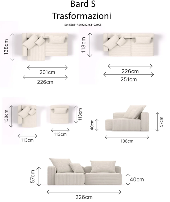 Divano modulare 5 posti BonBon3 E - sfoderabile e trasformabile in 2 letti da 2 persone