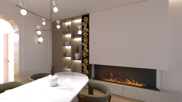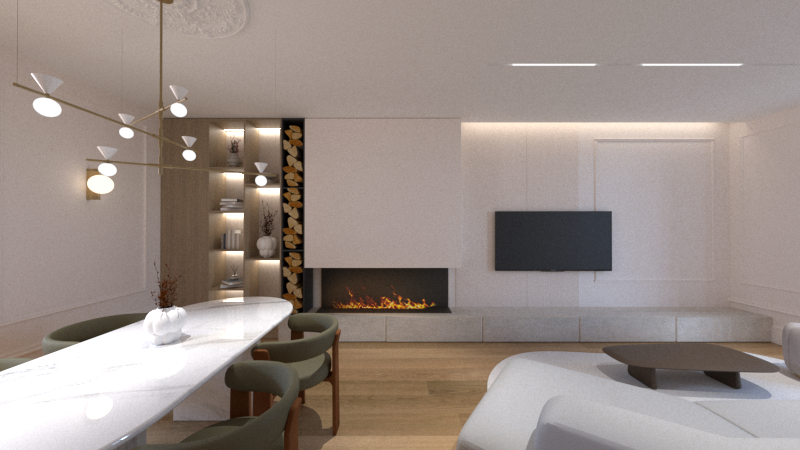 It also required the definition of a precise style, preferring a contemporary classic style with a touch of color and wanted to enhance the living room with the insertion of a fireplace.