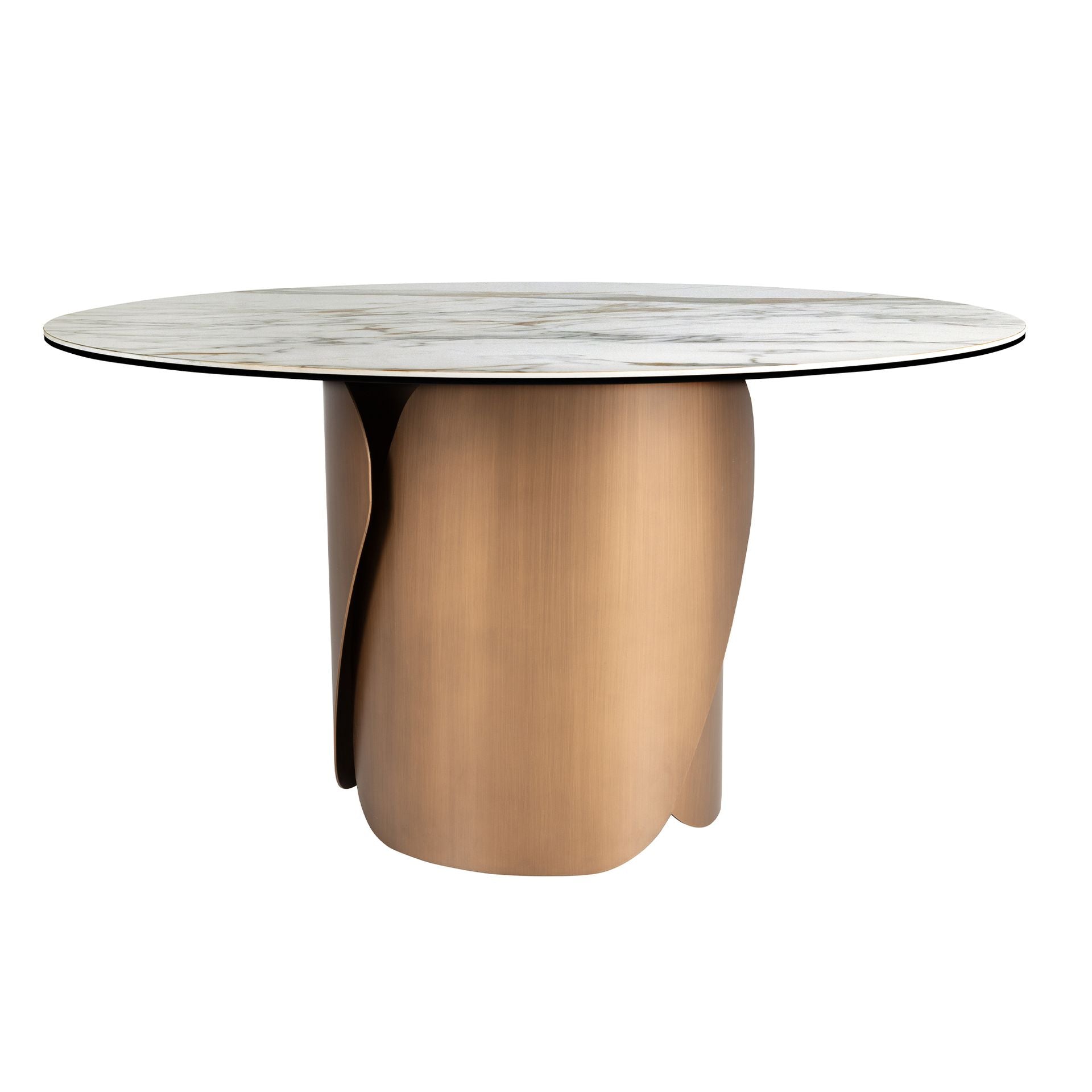 Tavolo da pranzo rotondo dal design moderno con piano fisso in marmo porcellanato bianco con venature grigie e dettagli ossidati con finitura lucida. Le sue originali gambe in acciaio inox color bronzo sono elementi chiave del suo design.