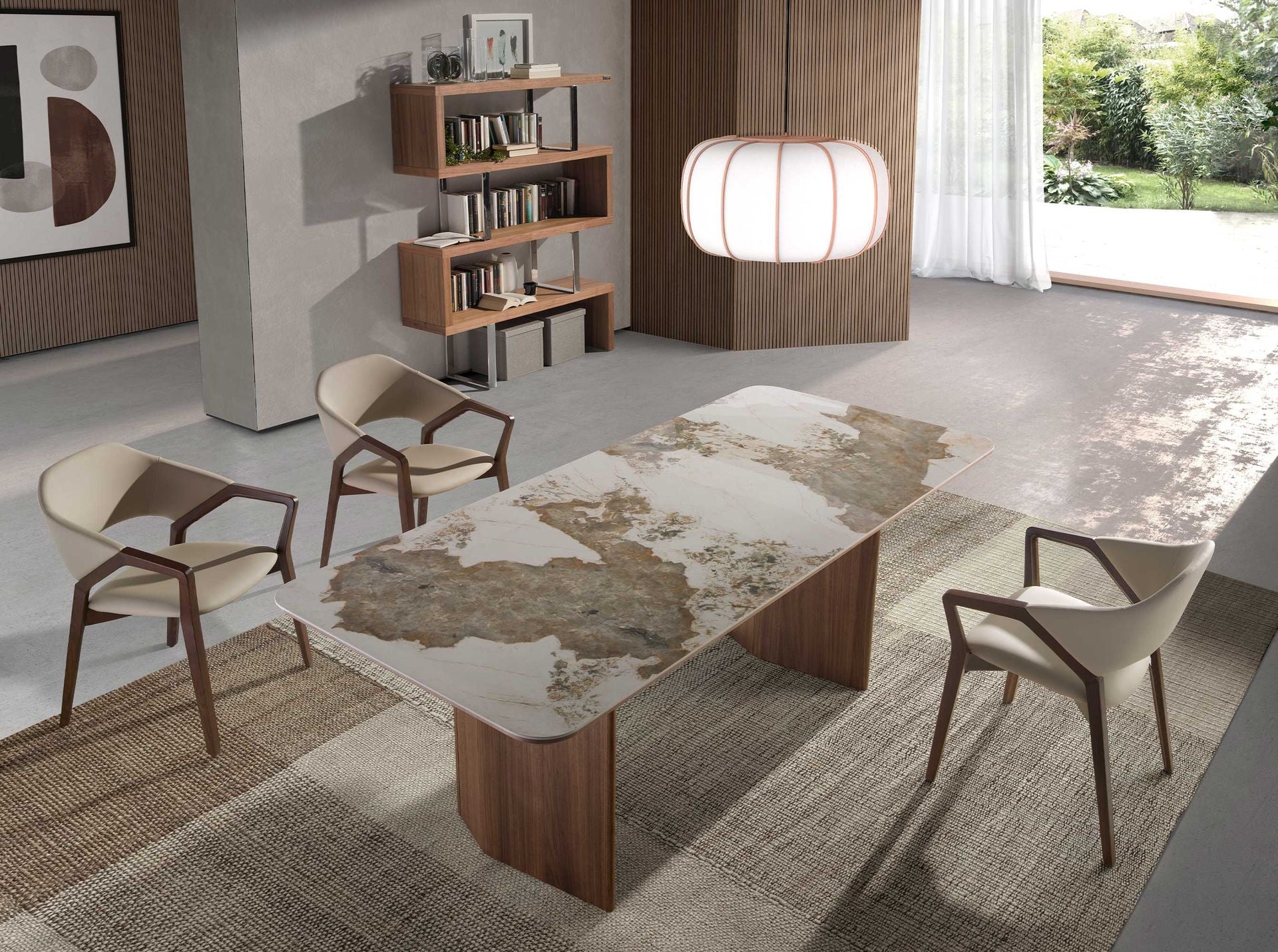 Sedia con braccioli dal design moderno con seduta e schienale rivestiti in similpelle visone. Le sue gambe in legno color noce, dallo stile avanguardista ma senza tempo, la renderanno un must per la vostra cucina o sala da pranzo. Questa sedia di Angel Cerdá unisce lo stile unico e personale del marchio al massimo comfort e stabilità, grazie all'alta qualità del rivestimento e alla struttura originale delle gambe.