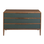 Cassettiera dal design moderno con struttura in PVC verde scuro e originali gambe in legno impiallacciato noce naturale. Dispone di un ampio spazio contenitivo con 3 cassetti con sistema di apertura a maniglia maschio e femmina e chiusura ammortizzata.