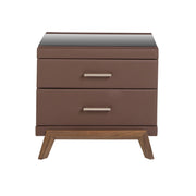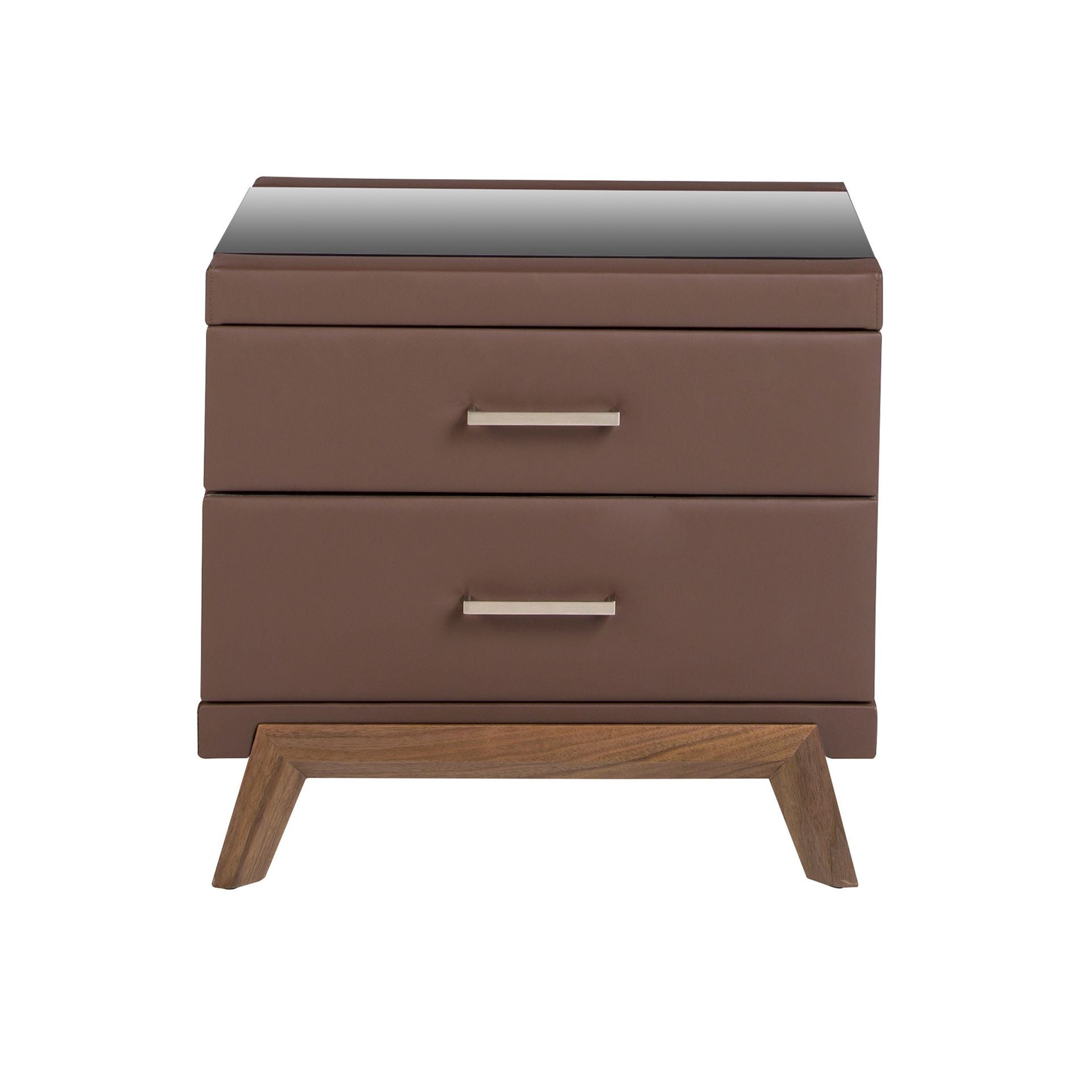 Comodino di design moderno con struttura in legno impiallacciato noce naturale rivestita in ecopelle marrone cioccolato e gambe originali in legno impiallacciato noce naturale. Grazie all'elegante piano in vetro colorato nero, otterrete il look sofisticato che cercate nelle vostre stanze. Dispone di un ampio spazio di archiviazione con 2 cassetti con sistema di apertura a strappo e chiusura ammortizzata.