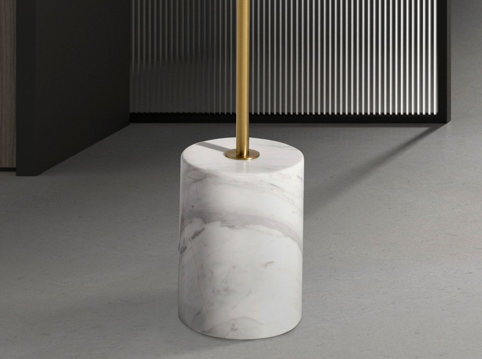 Lampada da terra in marmo bianco, acciaio dorato e vetro bianco