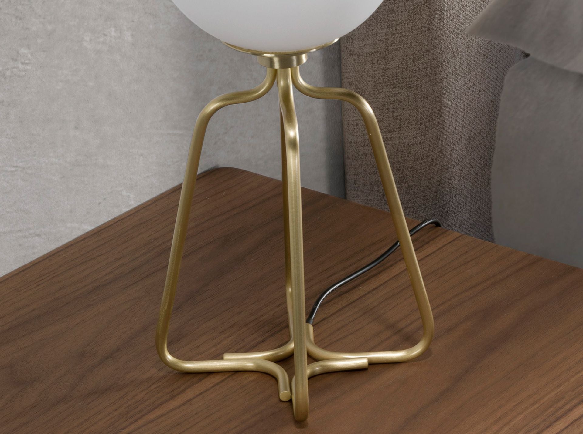 Lampada da tavolo con corpo in acciaio dorato e lampadina in vetro colorato bianco.
