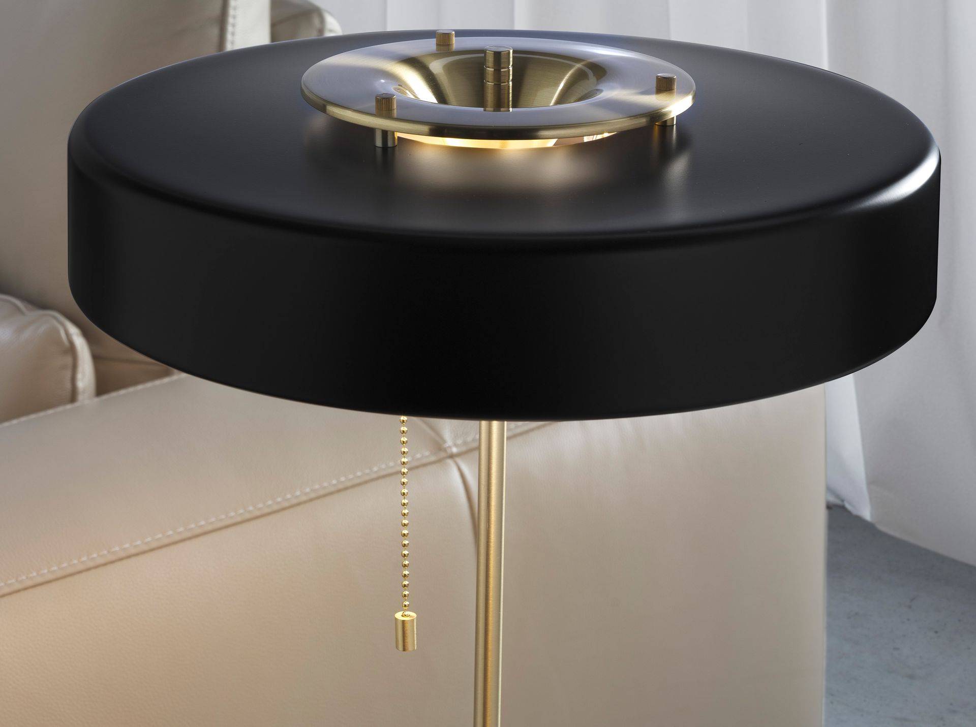 Lampada da tavolo in alluminio color oro. Paralume in alluminio nero opaco con protezione in vetro traslucido.