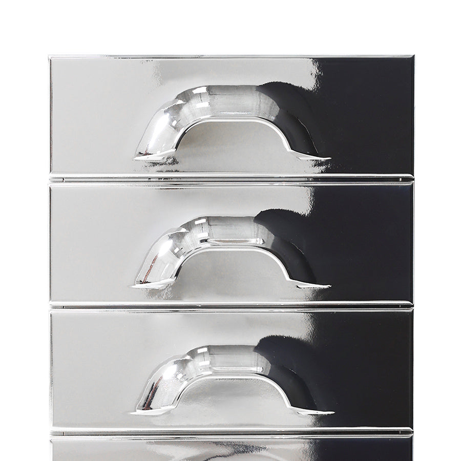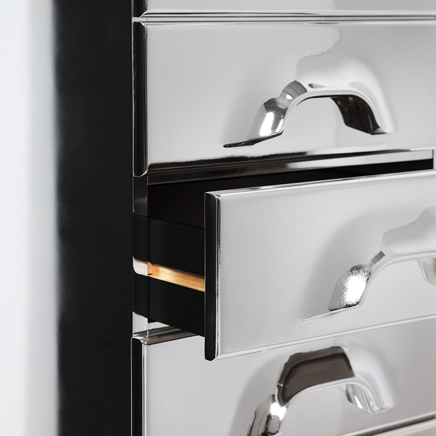 Fai una dichiarazione audace con questa straordinaria cassettiera con finitura cromata, ispirata all'estetica intrigante dell'era spaziale. La sua superficie elegante e riflettente e l'atmosfera futuristica lo trasformano in un vero pezzo di conversazione. Progettata per coloro che osano distinguersi, questa edizione speciale non è solo un semplice contenitore: è un elemento scultoreo che porta un tocco di glamour retro-futuristico ai tuoi interni.
