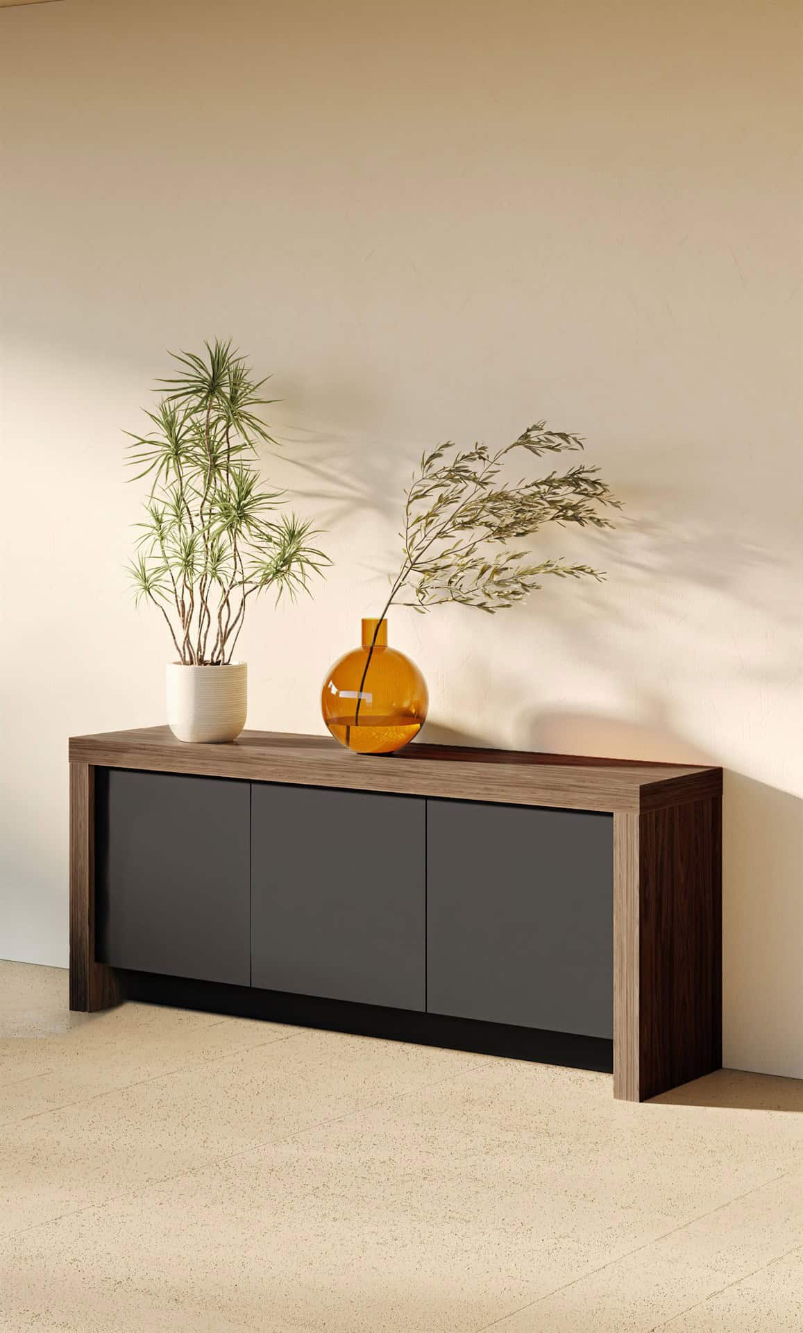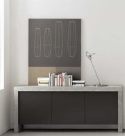 This very functional sideboard with its 2 push-pull doors and 3 drawers will allow you to easily store your dishes.The KOBE low sideboard contributes lightly to the decoration of your interior, while providing you with generous storage volumes.Materials: Honeycomb construction composed mainly of recycled wood particle board. Mixed finish in cement-effect melamine and satin black lacquer Dimensions Width: 188 cmHeight: 79 cmDepth: 45 cm