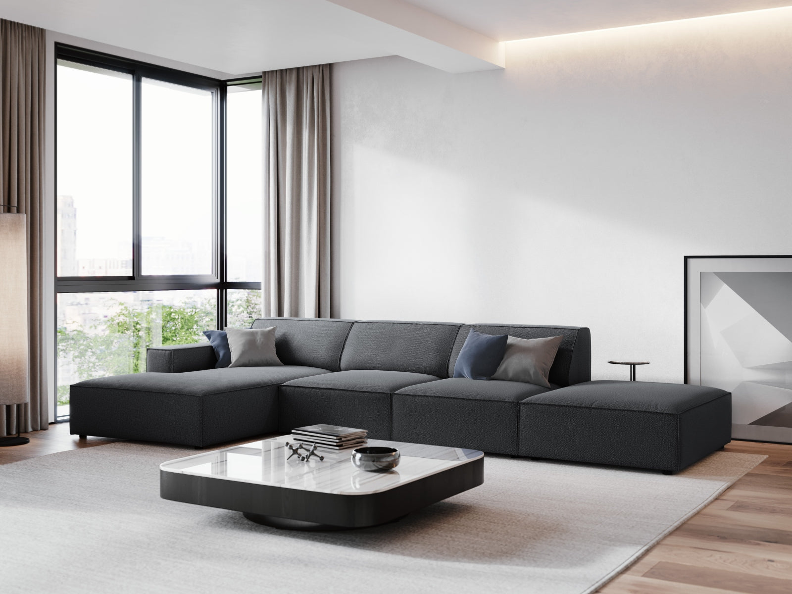 Lo spazioso divano modulare Jodie colpisce per la sua bella silhouette. La sua forma comodamente imbottita garantisce un riposo completo, mentre il sedile profondo e molleggiato consente un eccellente relax. Puoi anche appoggiarti agli schienali sagomati e agli ampi braccioli, che incoraggiano il relax sfrenato. Se stai cercando un divano spettacolare che ti faccia sentire comodo ma allo stesso tempo elegante, allora Jodi sarà la scelta migliore. Le gambe basse si armonizzano con la silhouette accogliente dei mobili. Un'ampia scelta di moduli ti permette di creare combinazioni adatte al meglio al tuo soggiorno.
