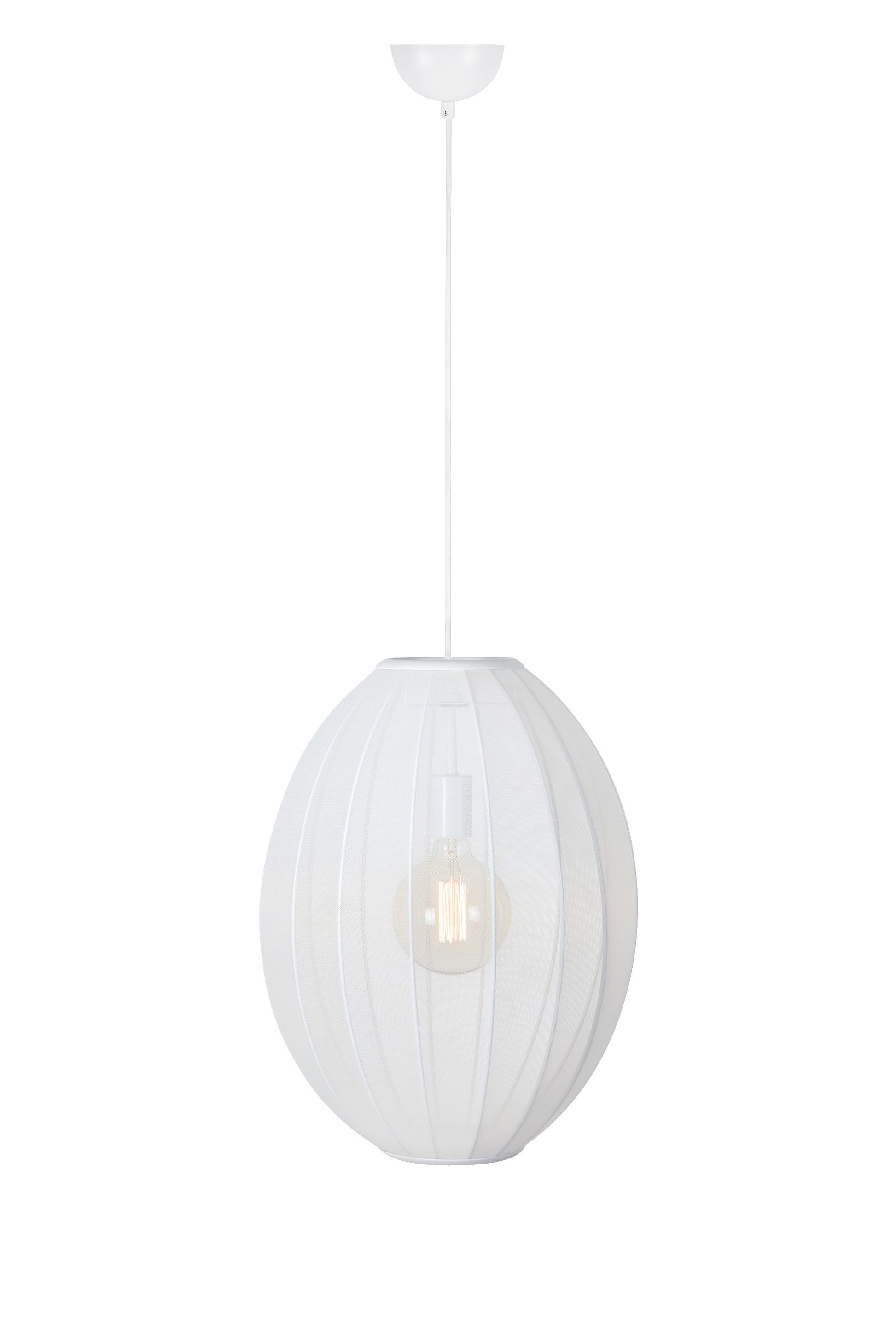 Lampada da soffitto ovale con paralume in tessuto bianco che lascia passare una piacevole luce generale. La lampada ha un diametro di 40 cm e un'altezza totale di 50 cm. Si adatta bene al soggiorno o alla camera da letto, preferibilmente raggruppati in diverse forme.