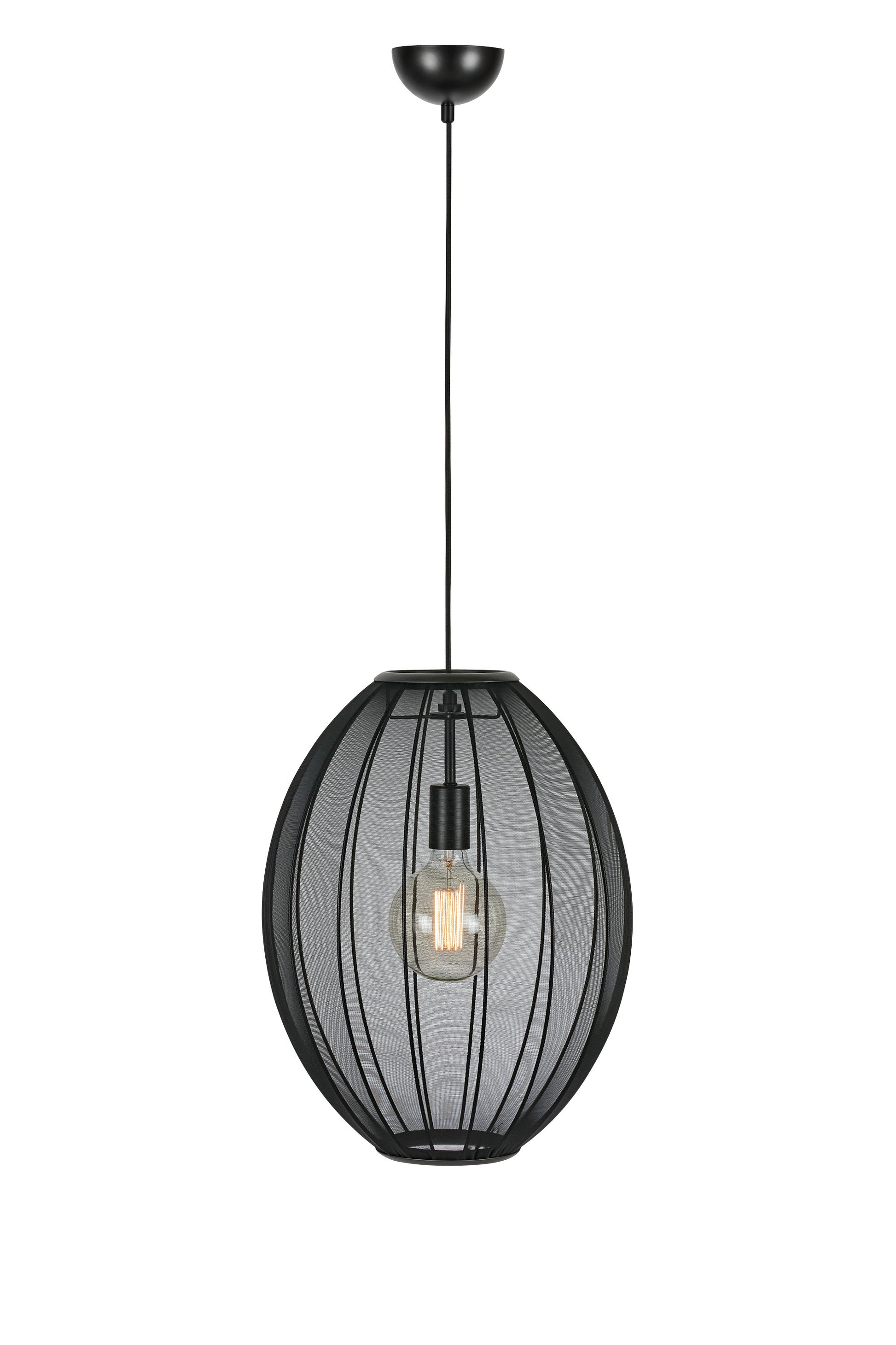 Lampada da soffitto ovale con paralume in tessuto nero che lascia passare una piacevole luce generale. La lampada ha un diametro di 40 cm e un'altezza totale di 50 cm. Si adatta bene al soggiorno o alla camera da letto, preferibilmente raggruppati in diverse forme.