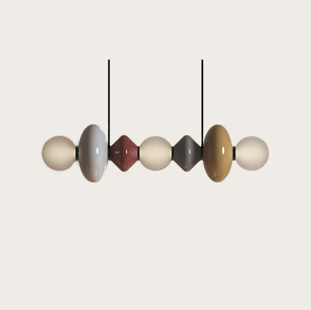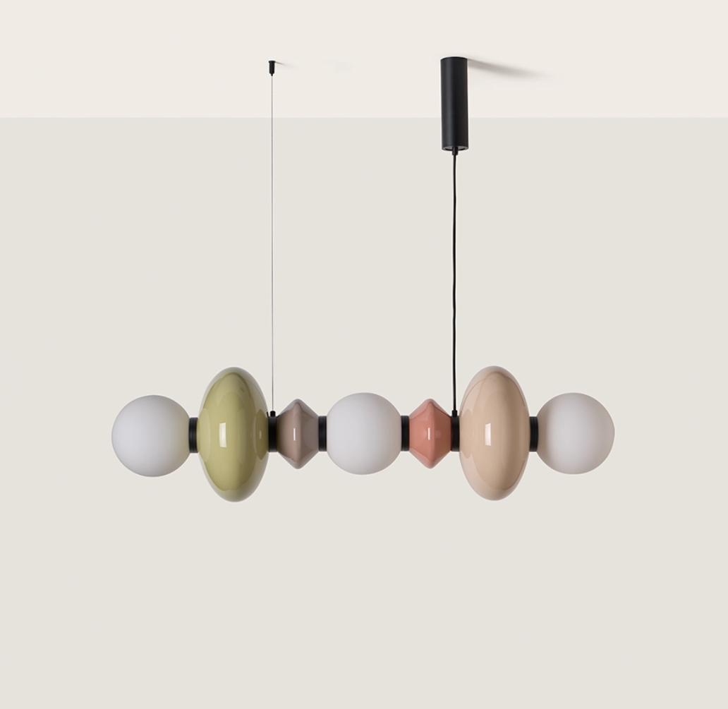 Illumina i tuoi spazi con eleganza e personalità. Questa lampada a sospensione decorativa, disegnata da Pepe Fornas (2024), è composta da tre punti luce LED con paralumi sferici in vetro opalino e quattro elementi in vetro dipinto a mano, che creano una composizione unica e dal carattere artistico.