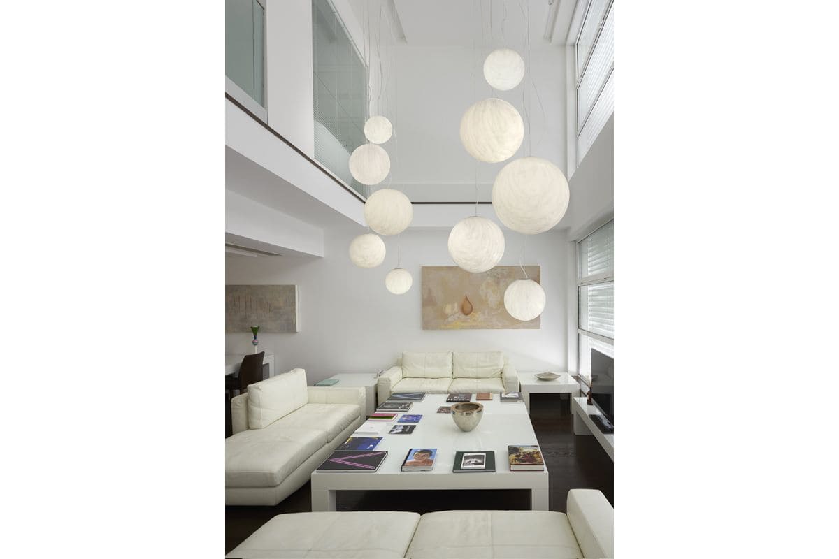 The MINERAL pendant lamp has a spherical shape and adapts to any indoor setting, both single, for a domestic environment, and with a multiple composition for contracts and events, to give a touch of contemporaneity to the environment. Mineral is made of marble polyethylene using an innovative technology that gives the product a very realistic, refined and elegant stone effect.