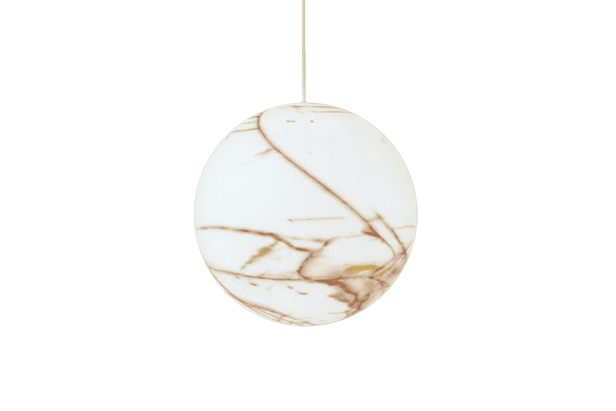 The pendant lamp is available in three different diameters with a white Carrara marble finish, available with red veining and a matt finish.