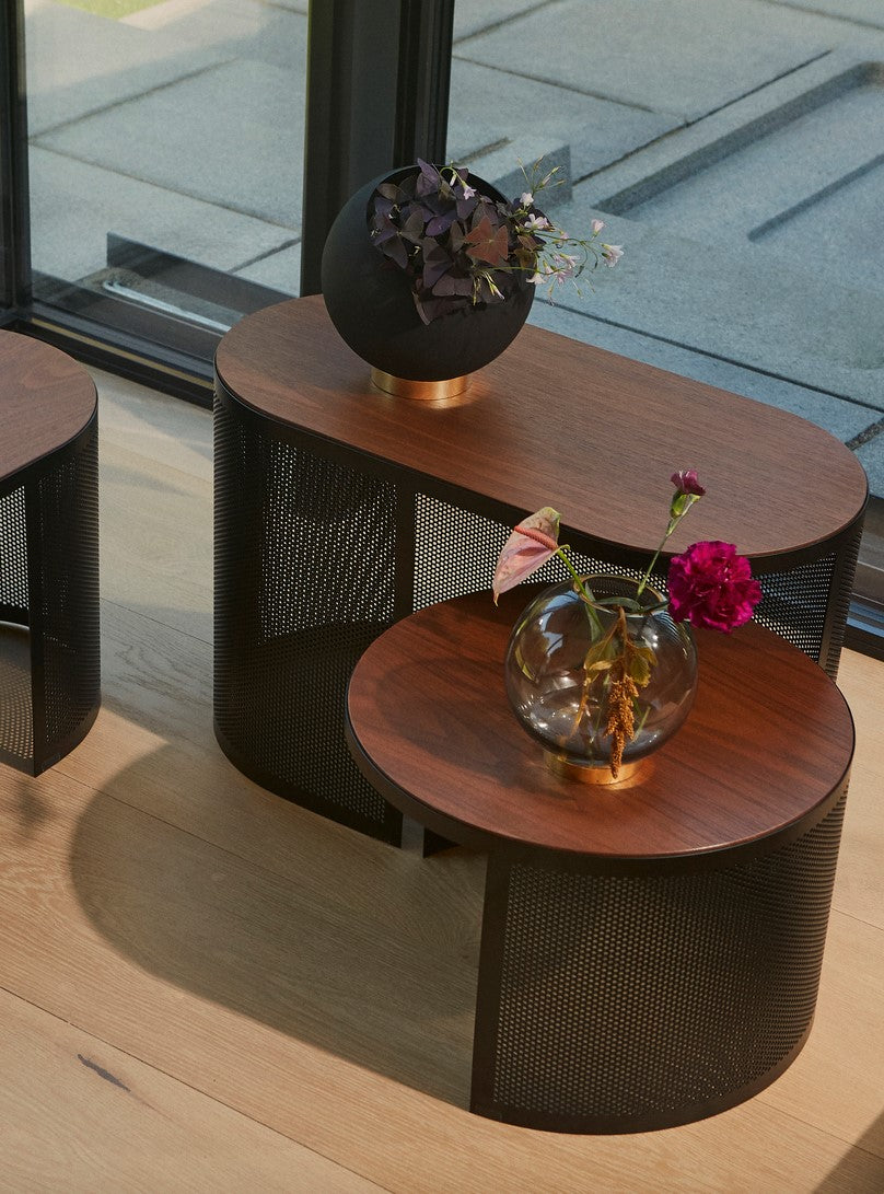I tavoli Pausillus possono essere collocati in qualsiasi stanza che richieda ulteriore spazio creativo. Sono realizzati in metallo traforato di colore nero e hanno un piano in marmo di alta qualità o in legno di noce. I Pausillus sono pensati per quell'angolo speciale della casa che ti è sacro, dove puoi rilassarti con un buon libro e uno spuntino.