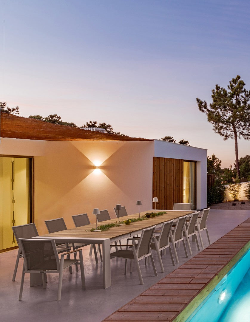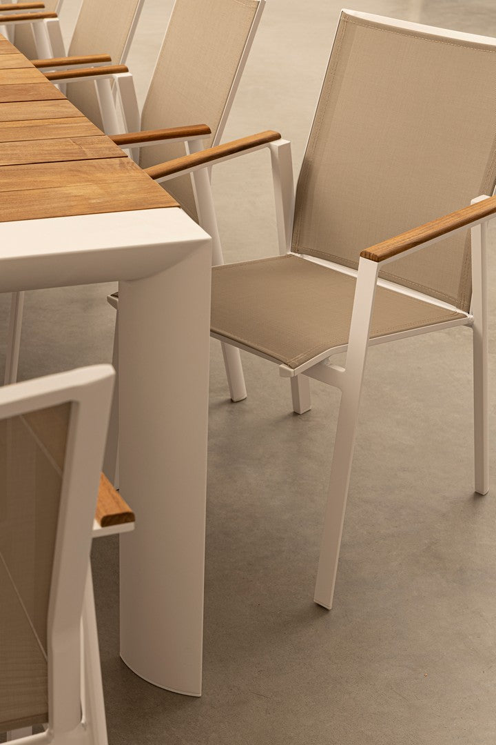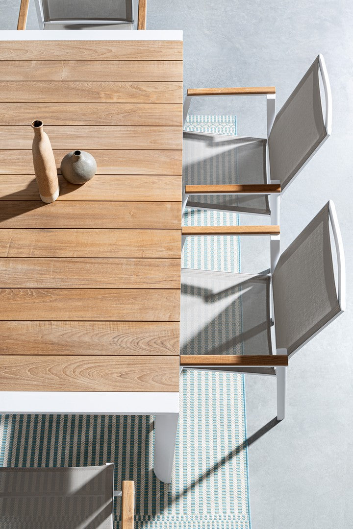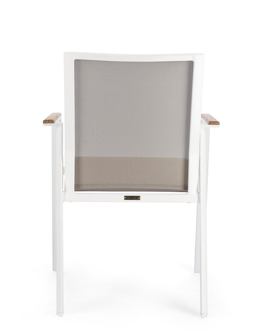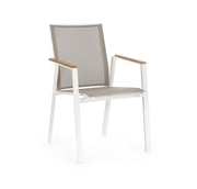 Struttura in alluminio, verniciato a polvere (poliestere). braccioli con inserti in teak. seduta e schienale rivestiti in textilene phifer 1x1. impilabile.