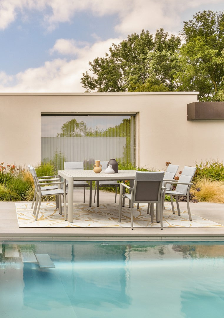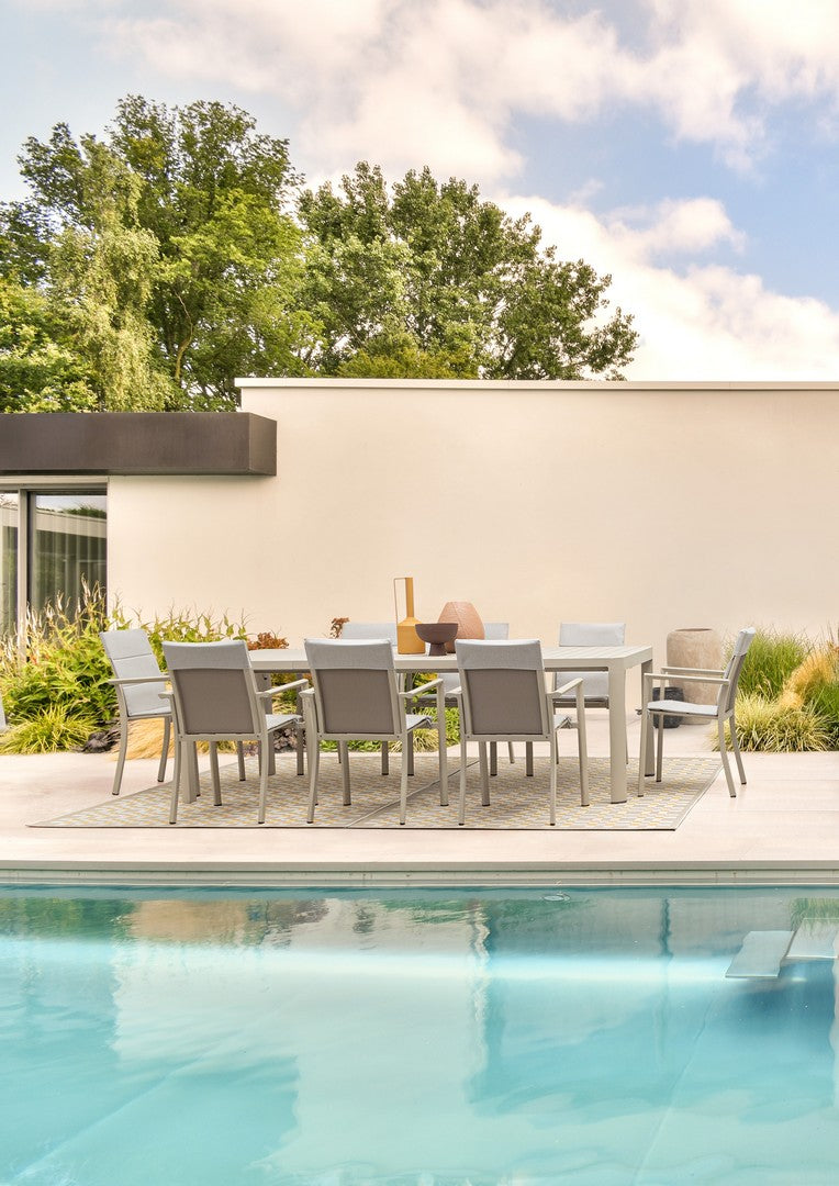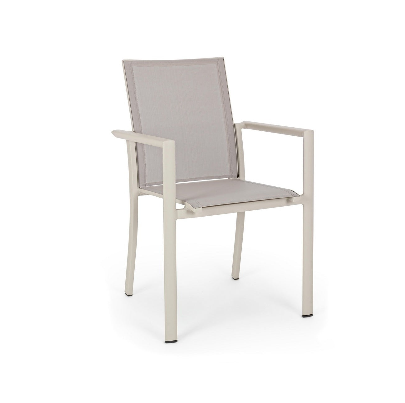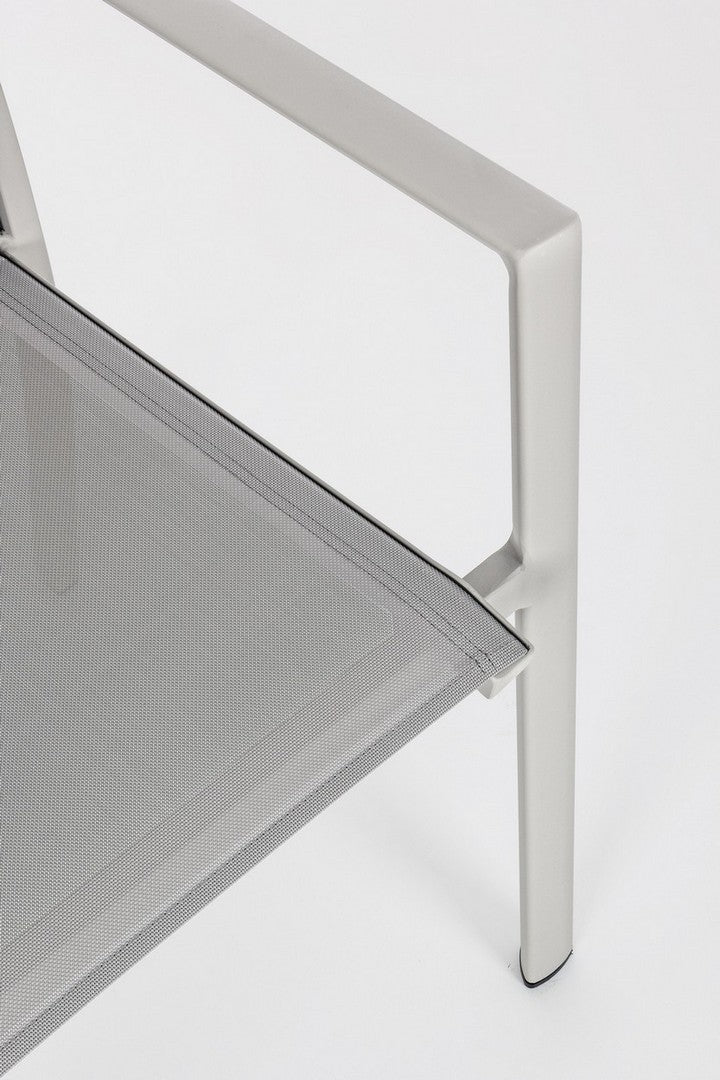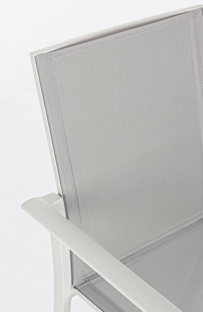 Struttura in alluminio, verniciato a polvere (poliestere). seduta e schienale in textilene 1x1. impilabile.