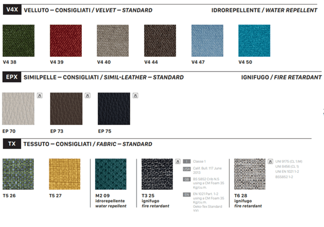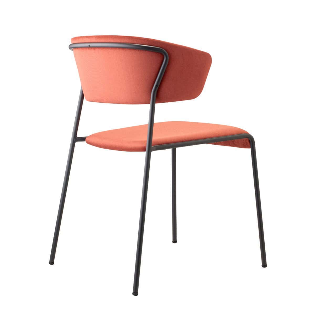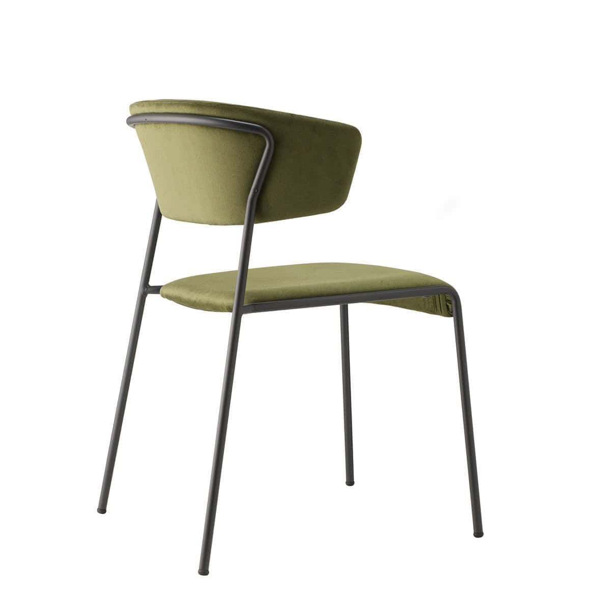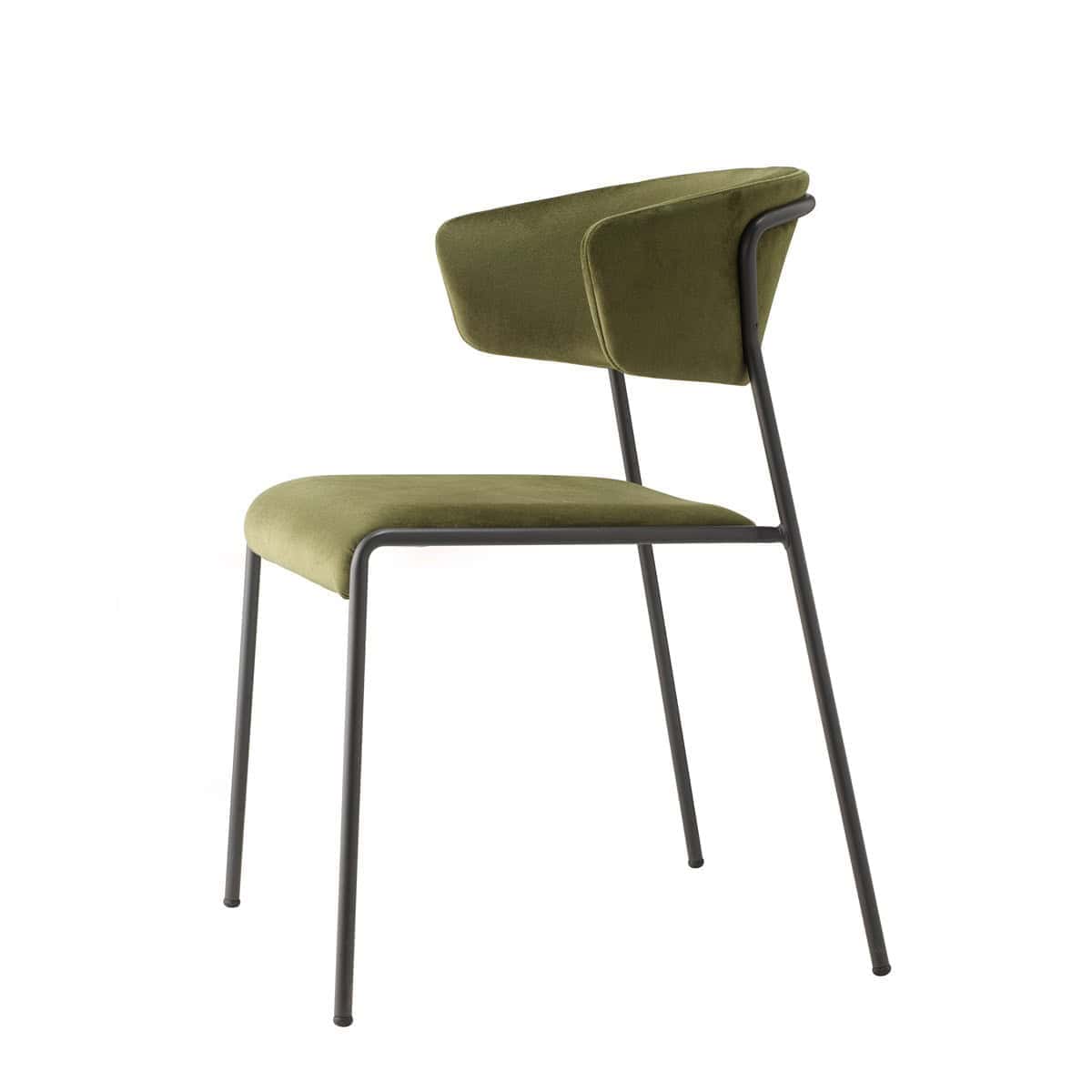 The Lisa Scab Design chair has a ø 16 mm tubular steel frame available in chrome, matt anthracite, satin brass or polished black nickel. The seat and backrest have a curved plywood core and are padded and upholstered in fabric, imitation leather, velvet or fireproof velvet.