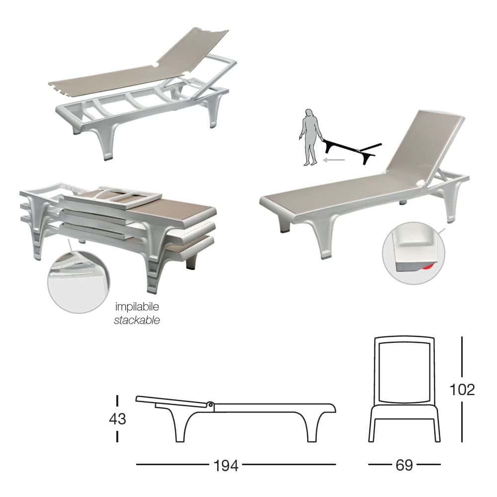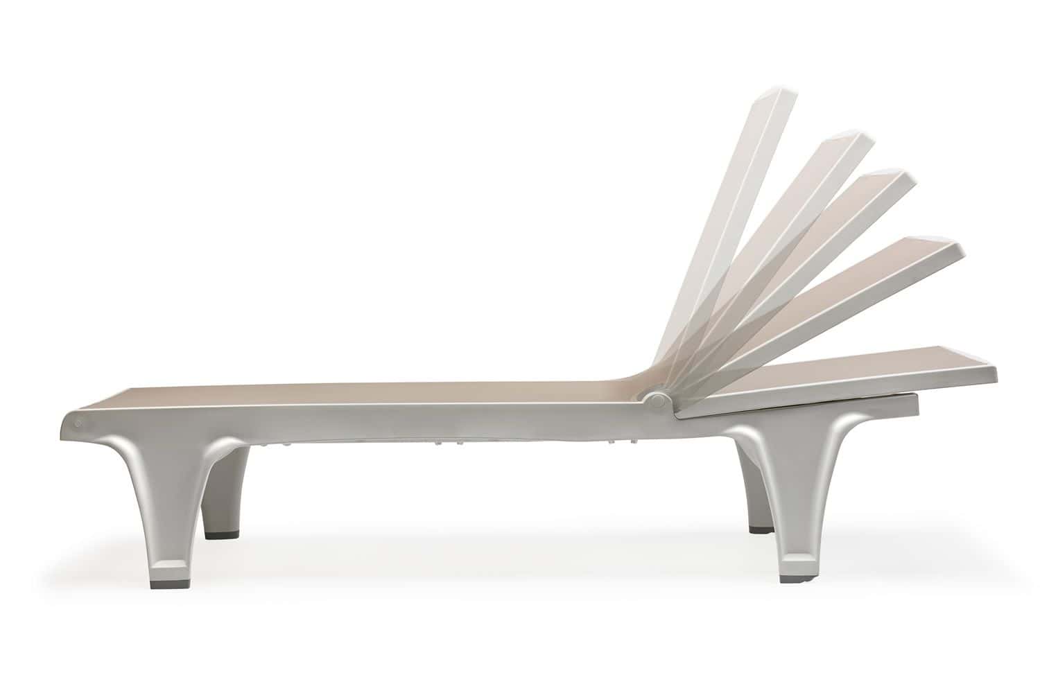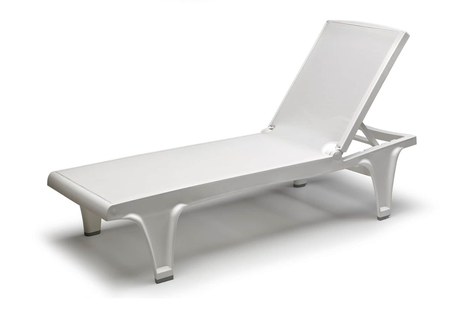 Technopolymer lounger, with replaceable fabric cover and reclining backrest, stackable.Elegant, simple and functional, the Tahiti designer lounger is ideal for furnishing the terrace, garden or poolside.The latest generation Tahiti is made with gas moulding technology in technopolymer reinforced with fibreglass which makes it resistant. The integrated rear wheels allow you to move it easily.The cover is made of synthetic fabric, breathable, water-repellent, non-deformable, resistant to UV rays, heat-sealed. Easy to clean with soap and water, the cover is easily replaceable by anyone and can be used twice because it is reversible.Tahiti is equipped with a backrest adjustable in 5 positions and can be stacked up to 20 pieces.The following versions are available: