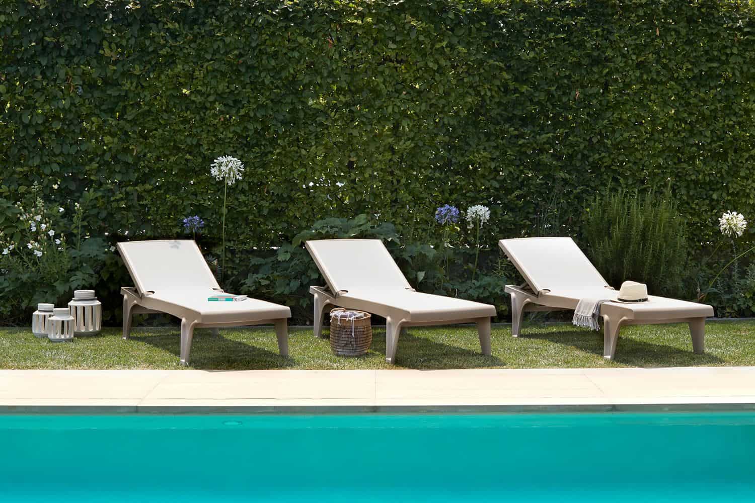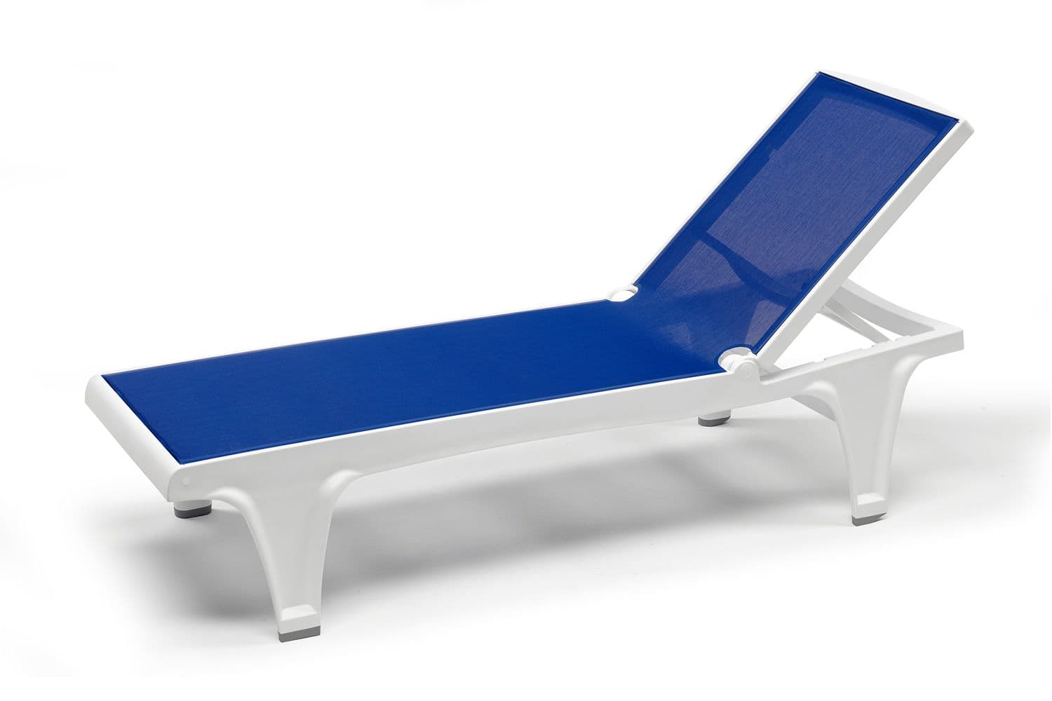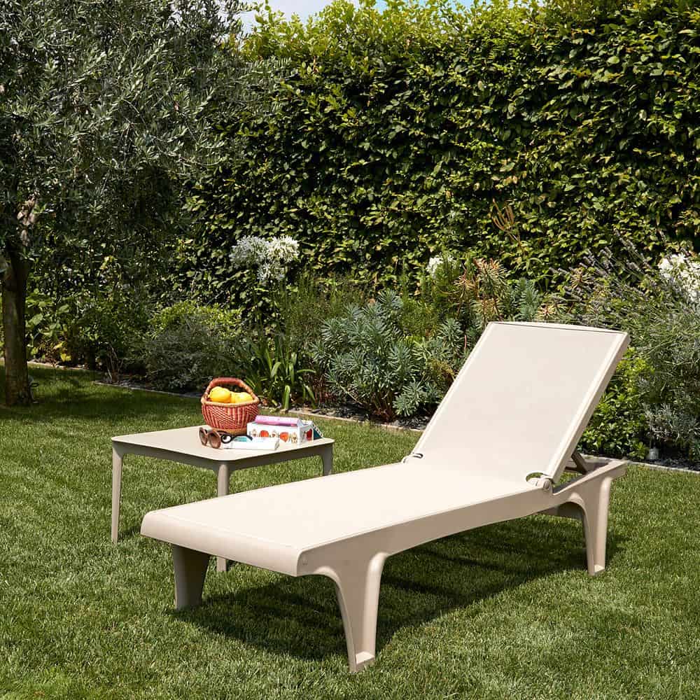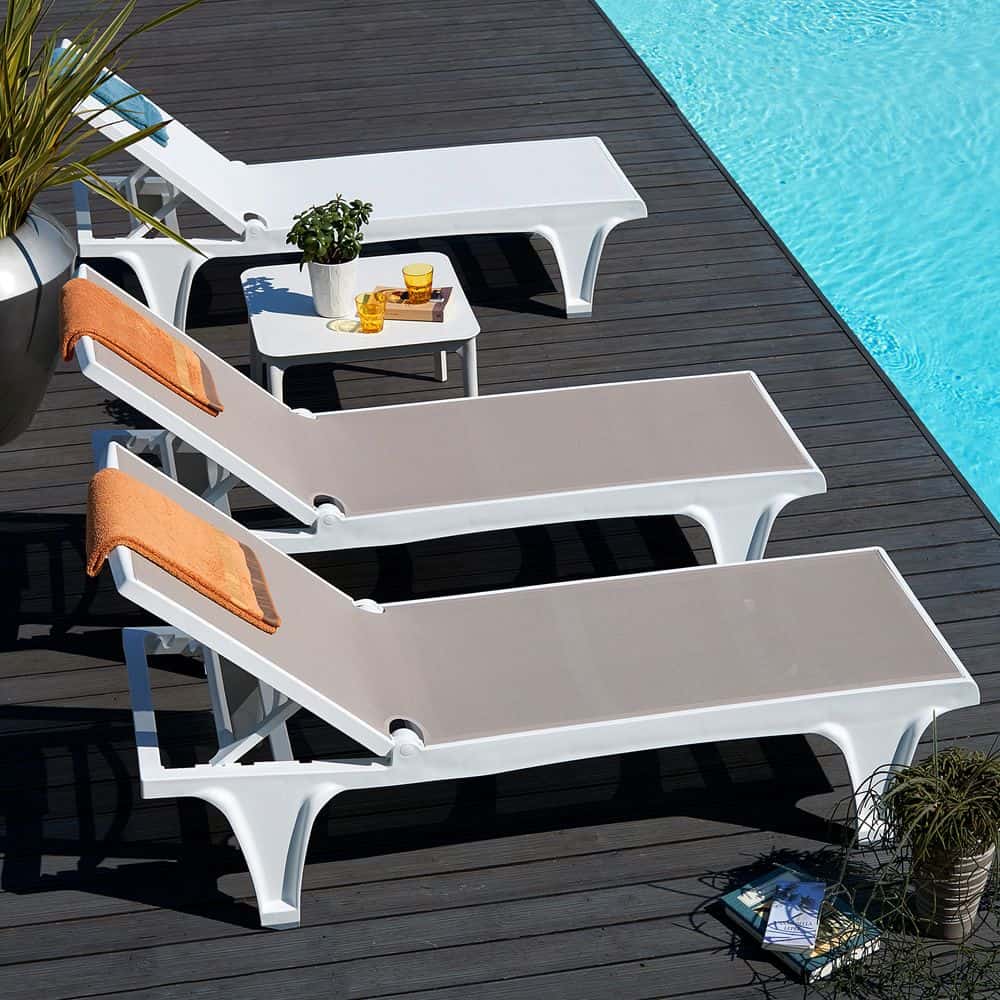 Technopolymer lounger, with replaceable fabric cover and reclining backrest, stackable.Elegant, simple and functional, the Tahiti designer lounger is ideal for furnishing the terrace, garden or poolside.The latest generation Tahiti is made with gas moulding technology in technopolymer reinforced with fibreglass which makes it resistant. The integrated rear wheels allow you to move it easily.The cover is made of synthetic fabric, breathable, water-repellent, non-deformable, resistant to UV rays, heat-sealed. Easy to clean with soap and water, the cover is easily replaceable by anyone and can be used twice because it is reversible.Tahiti is equipped with a backrest adjustable in 5 positions and can be stacked up to 20 pieces.The following versions are available: