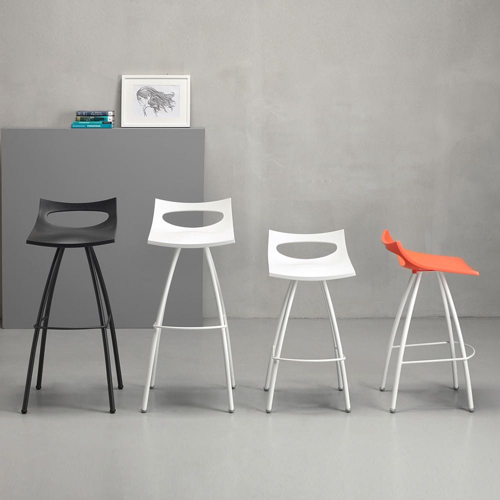 Metal and technopolymer stool, seat height 80 cmThis stool, ideal for the kitchen, has a tubular steel frame with a chrome finish or painted with polyester powder in linen white or anthracite grey. The seat is made of technopolymer, available in different colours.The made in Italy stool is available in two sizes: