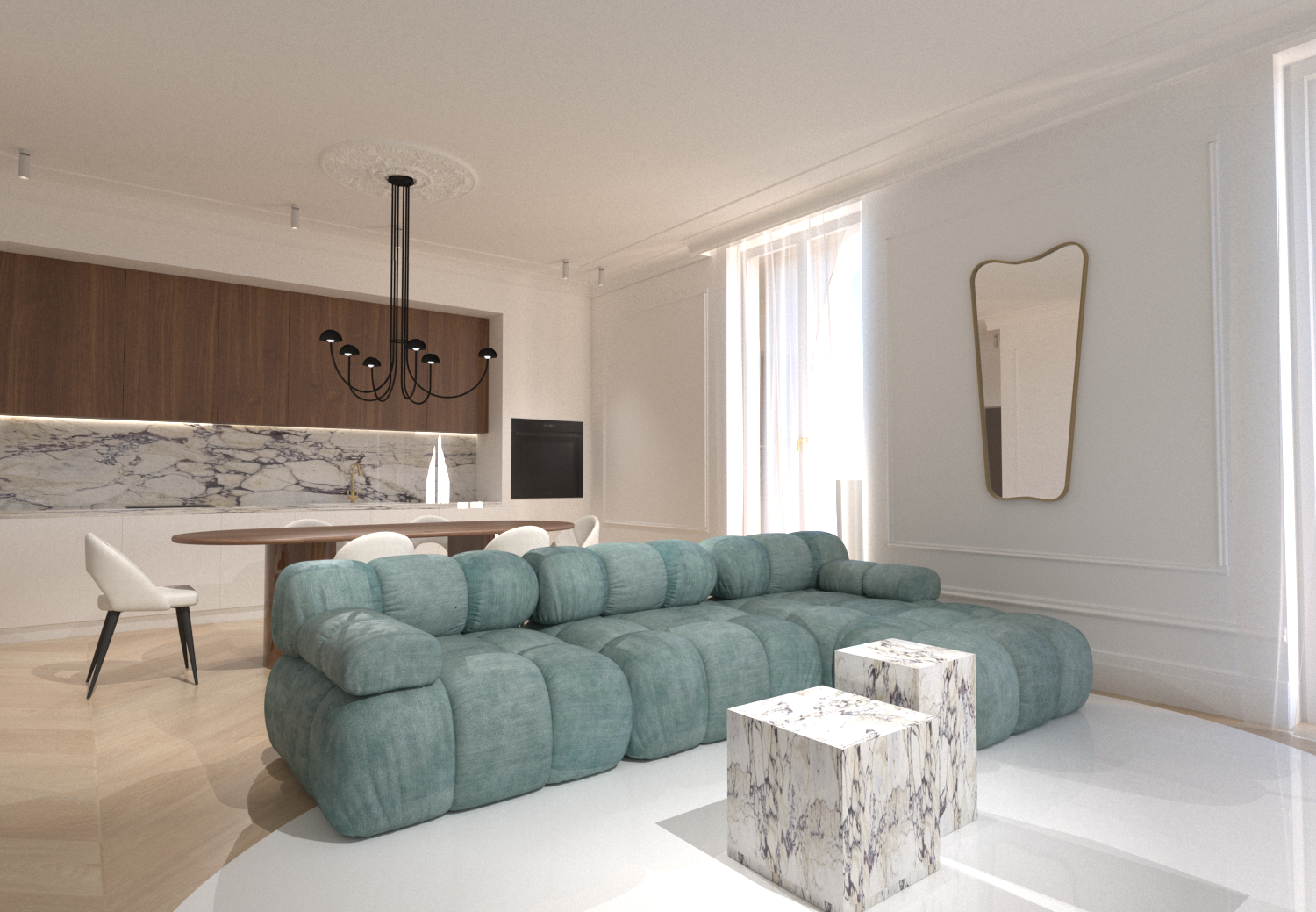 Projet d'ameublement et de finition pour un appartement à rénover, alliant le charme intemporel du style classique aux lignes minimales du contemporain.