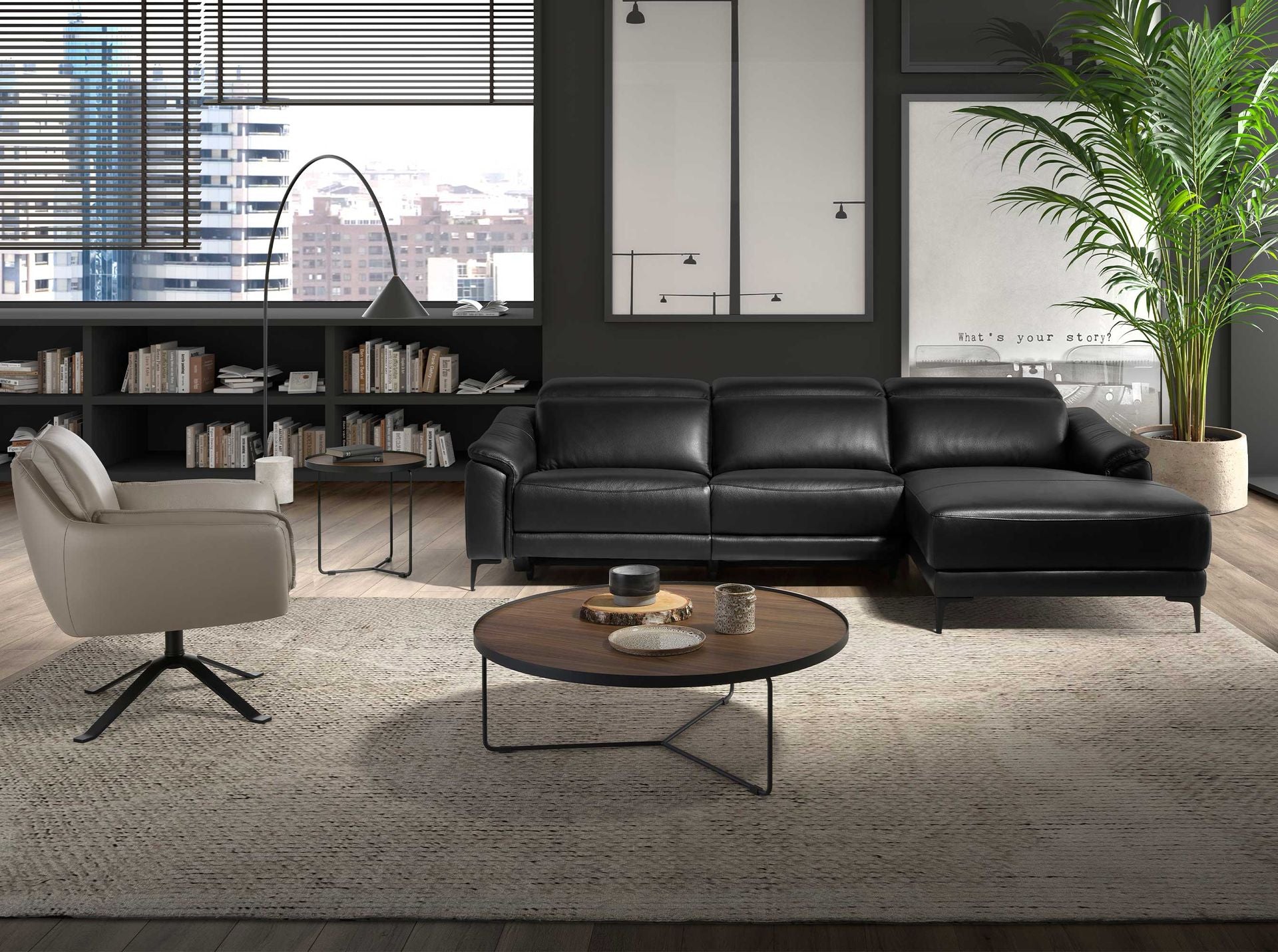 Tavolino rotondo dal design moderno con piano in legno impiallacciato in noce naturale e originali gambe in acciaio inox verniciato con polveri epossidiche nere. Un pezzo dal design semplice ma originale, con il quale aggiungerete un tocco unico e personale.
