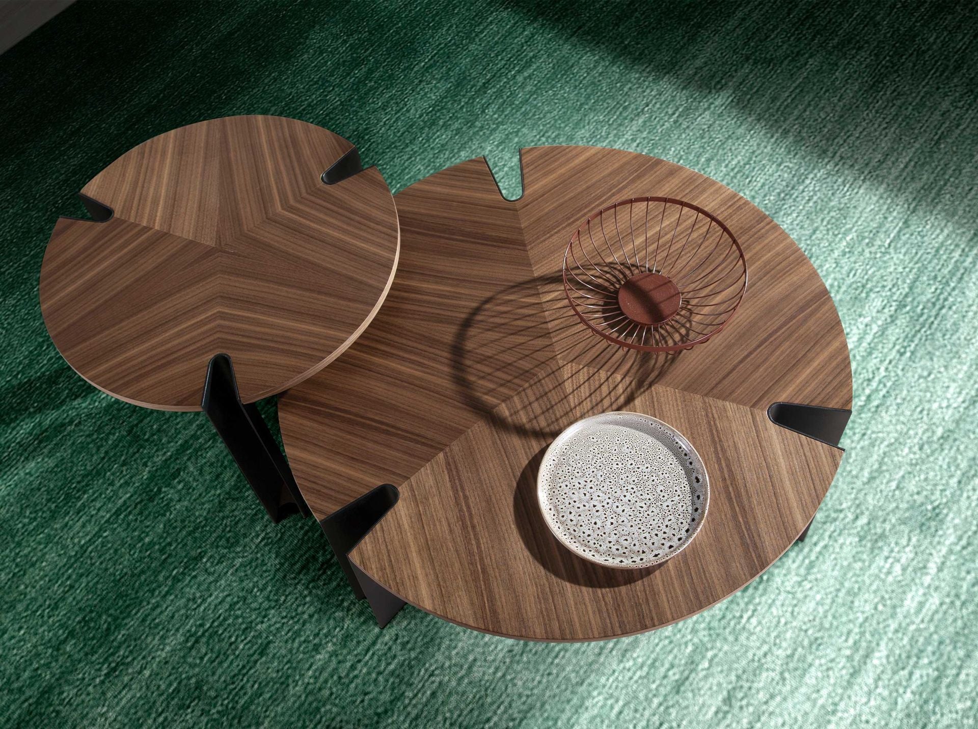 Tavolino rotondo dal design moderno con piano in legno impiallacciato in noce naturale e originali gambe in acciaio inox verniciato con polveri epossidiche nere. Un pezzo dal design semplice ma originale che aggiungerà un tocco unico e personale.