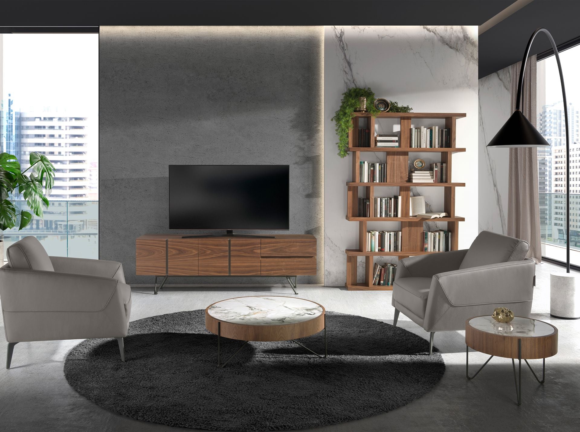Tavolo rotondo ad angolo in marmo porcellanato, noce e acciaio nero model 2139 Angel Cerdá S.L.