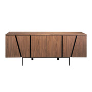 Credenza dal design moderno con struttura in legno impiallacciato di noce naturale e gambe originali in acciaio inox verniciato con vernice epossidica nera. L'originale dettaglio in acciaio inox verniciato con vernice epossidica nera aggiunge un perfetto tocco di stile al vostro salotto. Dispone di un ampio spazio di archiviazione con 4 ante con apertura estraibile maniglia a uncino e chiusura ammortizzata.