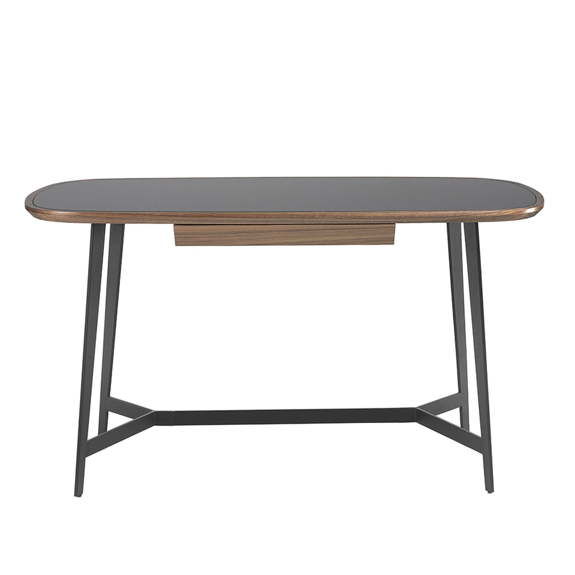 Scrivania in noce e acciaio nero con piano in vetro nero