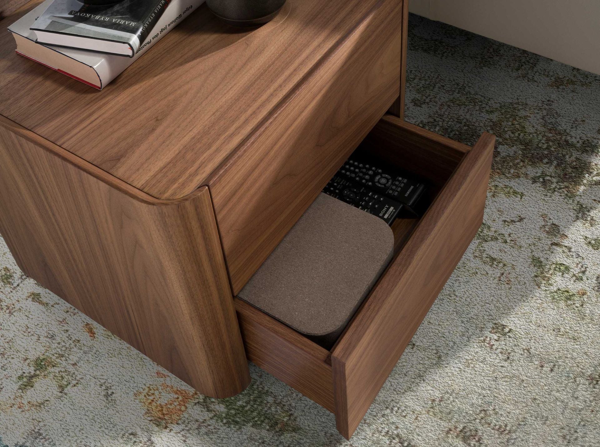 - Questo elegante comodino in impiallacciatura di noce naturale di 0,5 mm di spessore darà alla vostra camera da letto il tocco moderno e diverso che cercate.