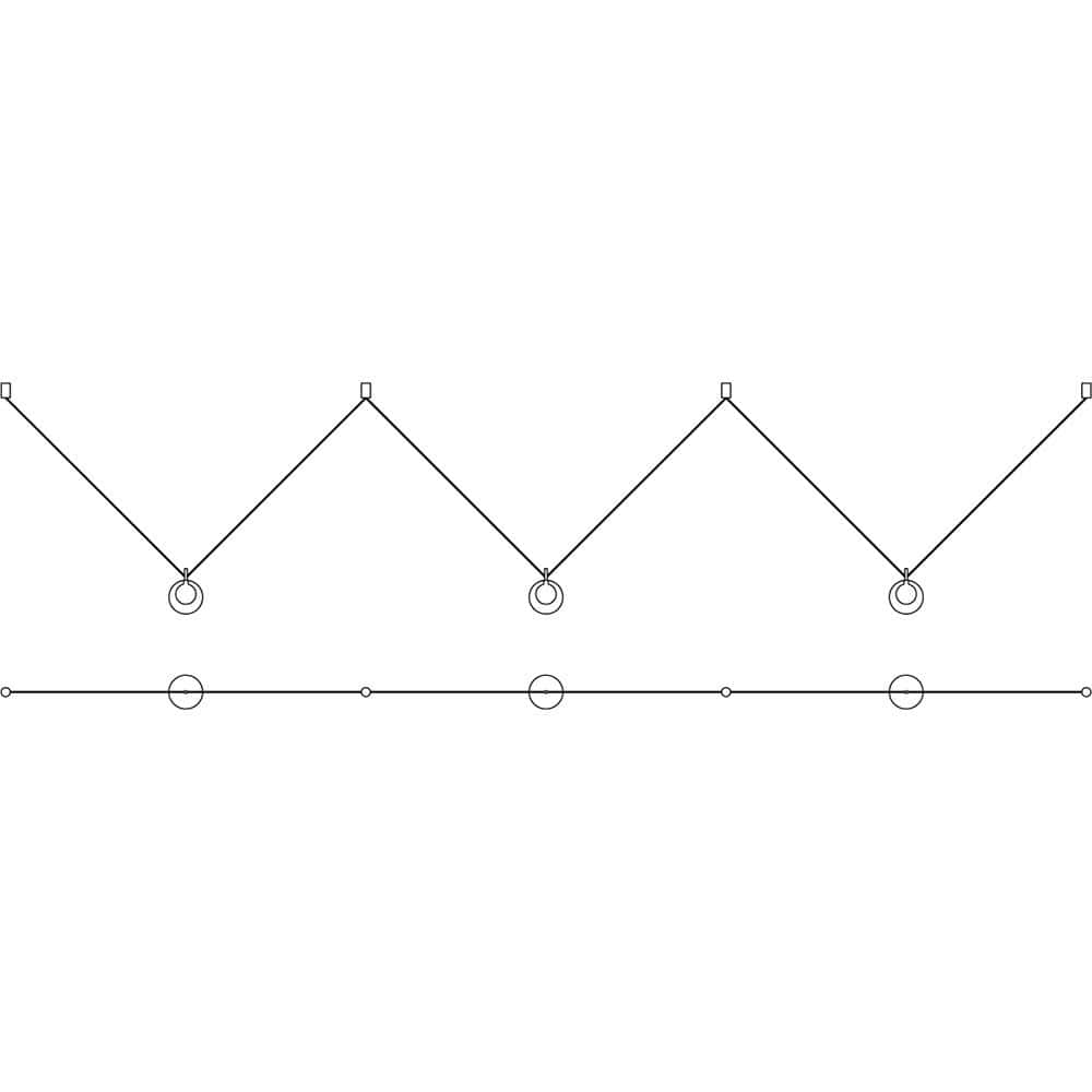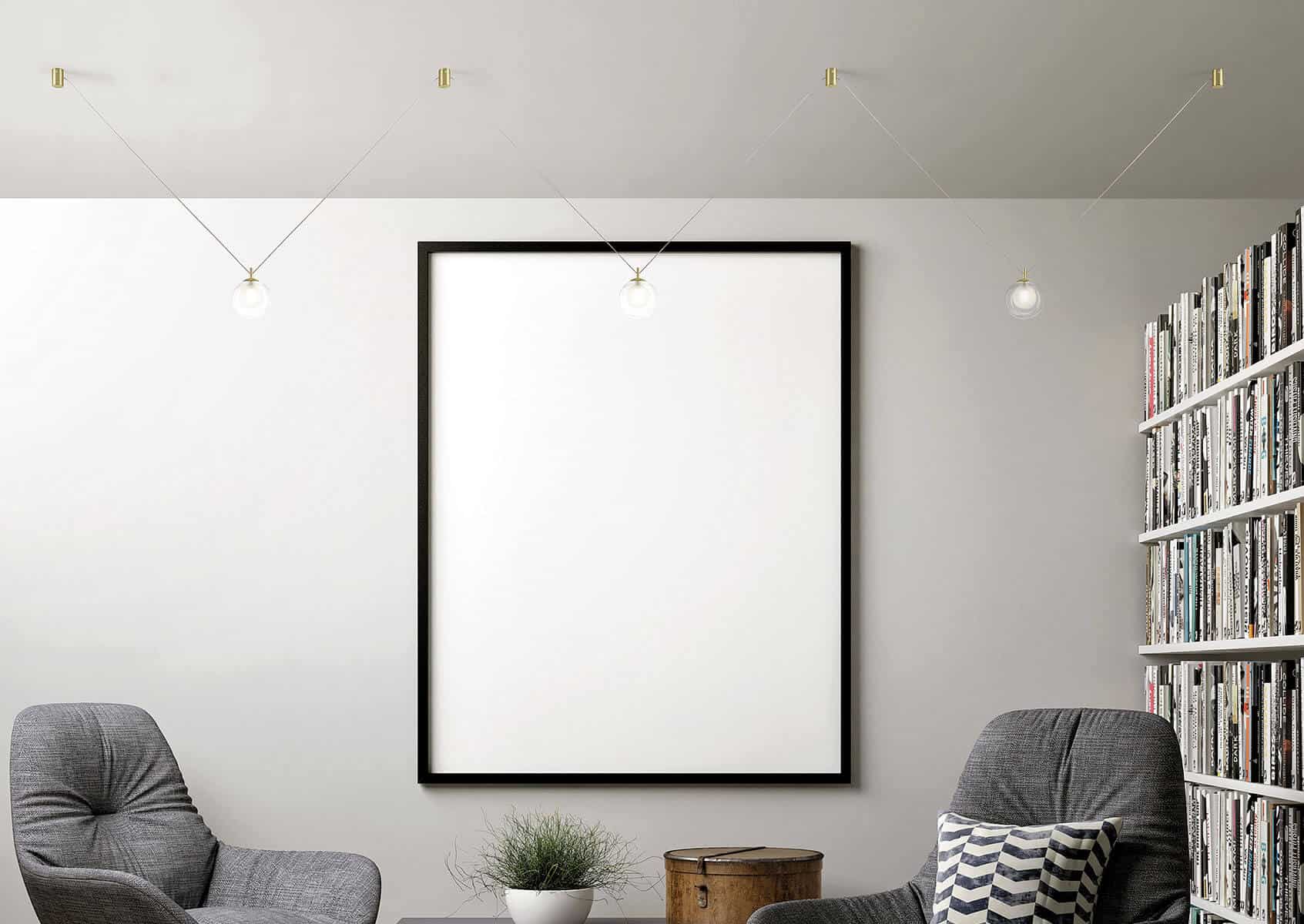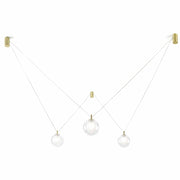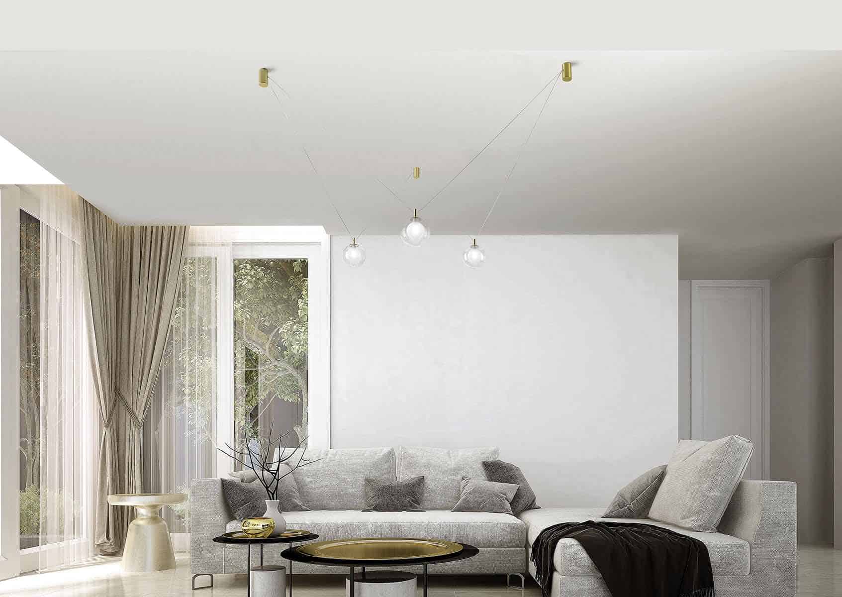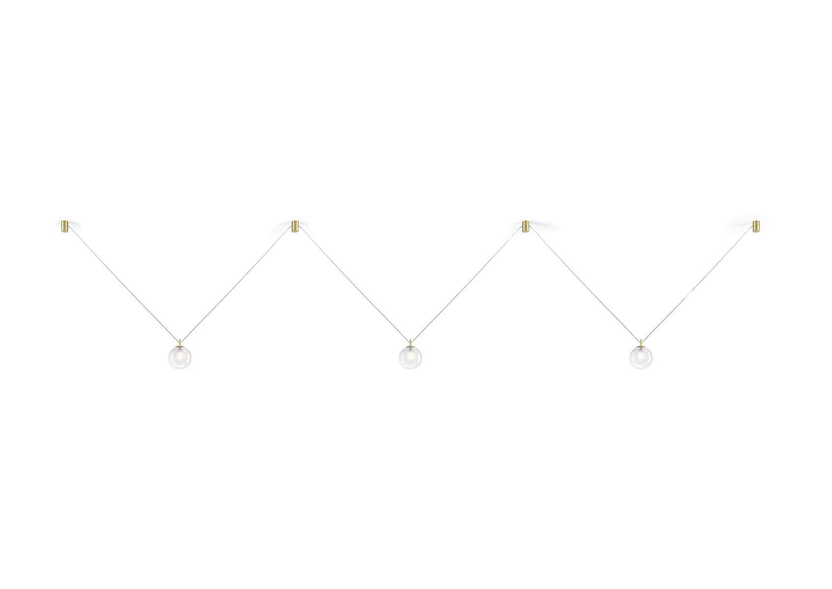 Le système, composé de pièces métalliques dorées brossées, a la capacité de prendre le courant de n'importe quelle rosace et, grâce aux connexions, d'apporter de l'éclairage à n'importe quel point lumineux.