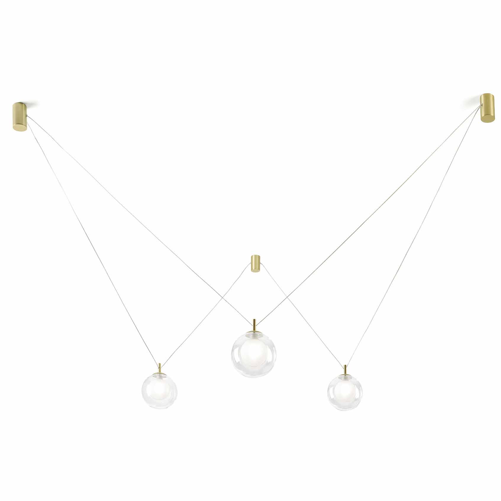 Lampe suspension 3 lumières en verre borosilicaté transparent à l'extérieur et verre satiné à l'intérieur, diamètre 15 cm, longueur câble 200 cm.