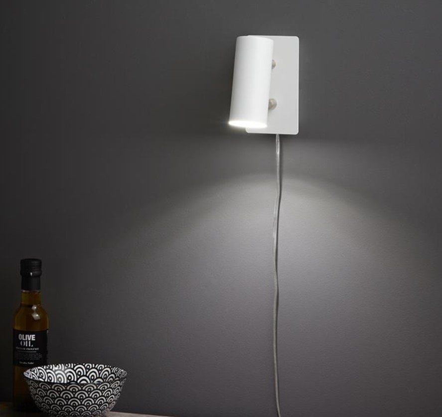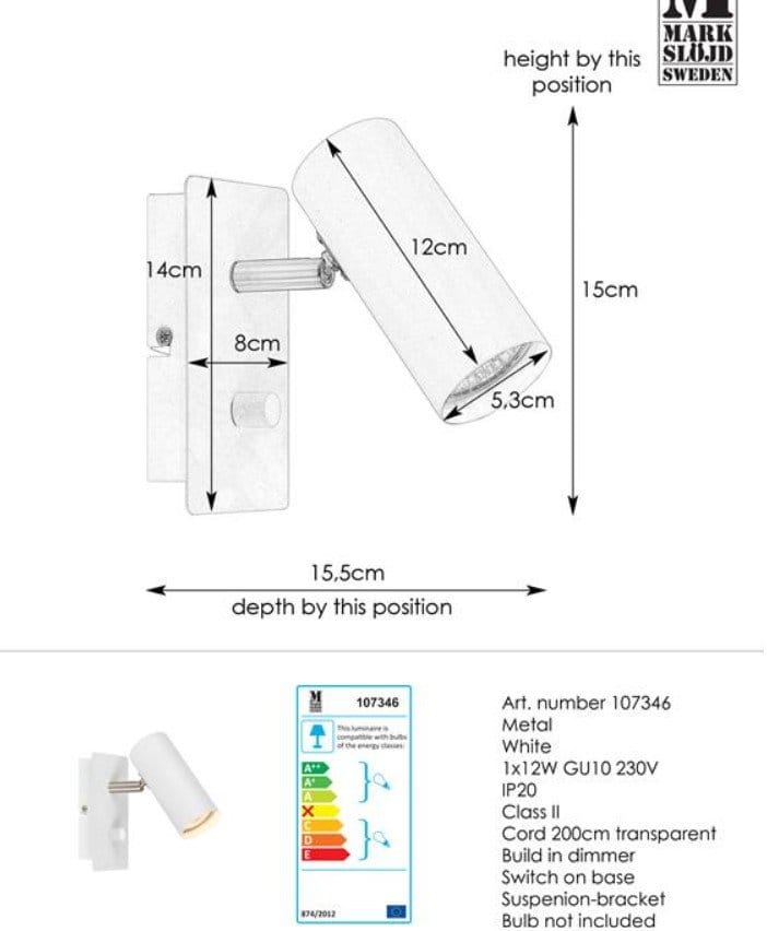 Applique en métal Barcelona de Markslöjd. Tête de lampe réglable. Variateur LED intégré / interrupteur mural. Douille GU10. LED maximale 12W. Boîtier de connexion à l'intérieur de la plaque murale pour un retrait facile des câbles et une transition vers une installation fixe.