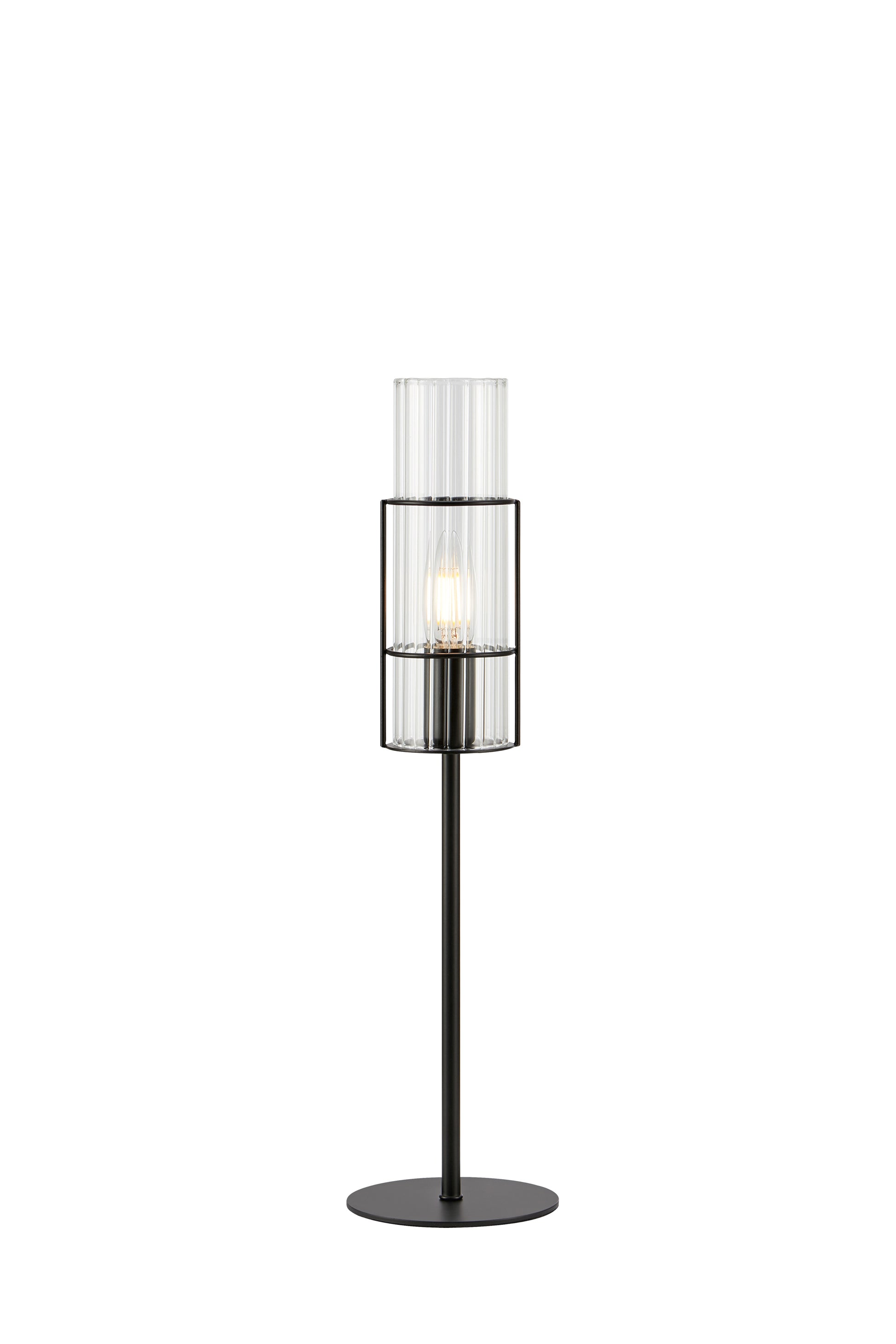 La lampada da tavolo Tubo ha il vetro ondulato ed è disponibile in due dimensioni: 50 e 65 cm di altezza. È una buona idea posizionare entrambe le dimensioni una accanto all'altra e accanto al muro per ottenere effetti d'ombra.