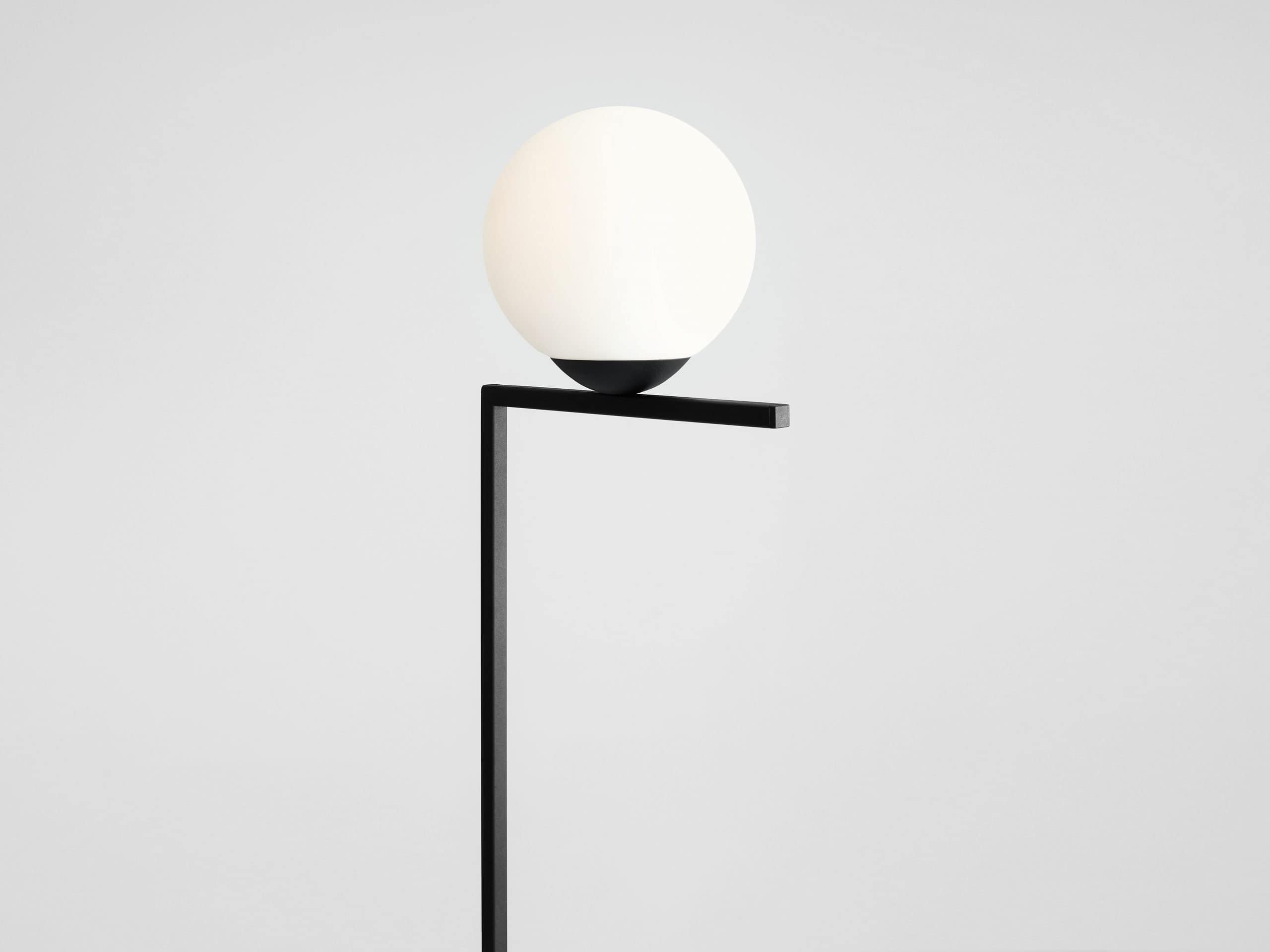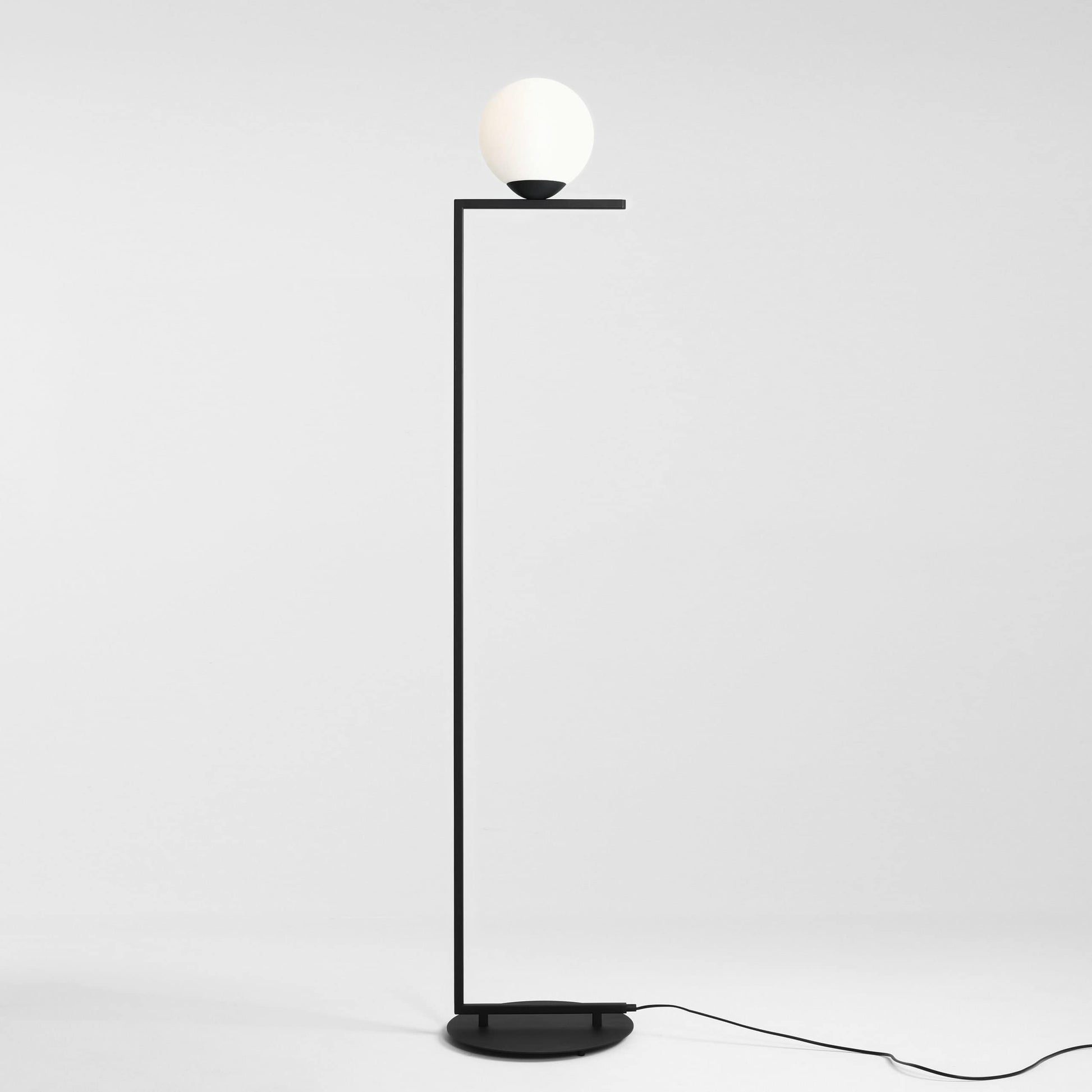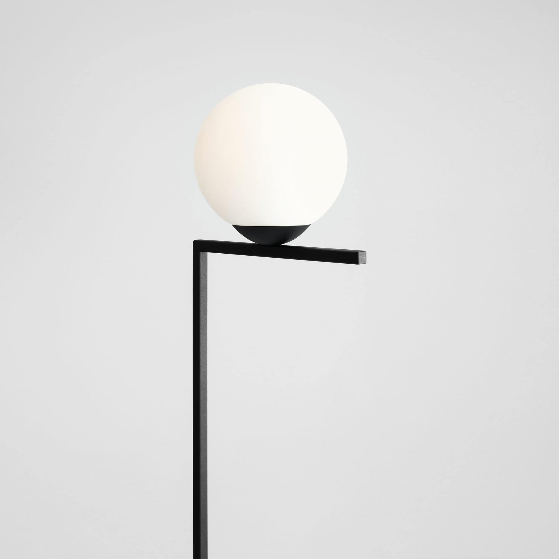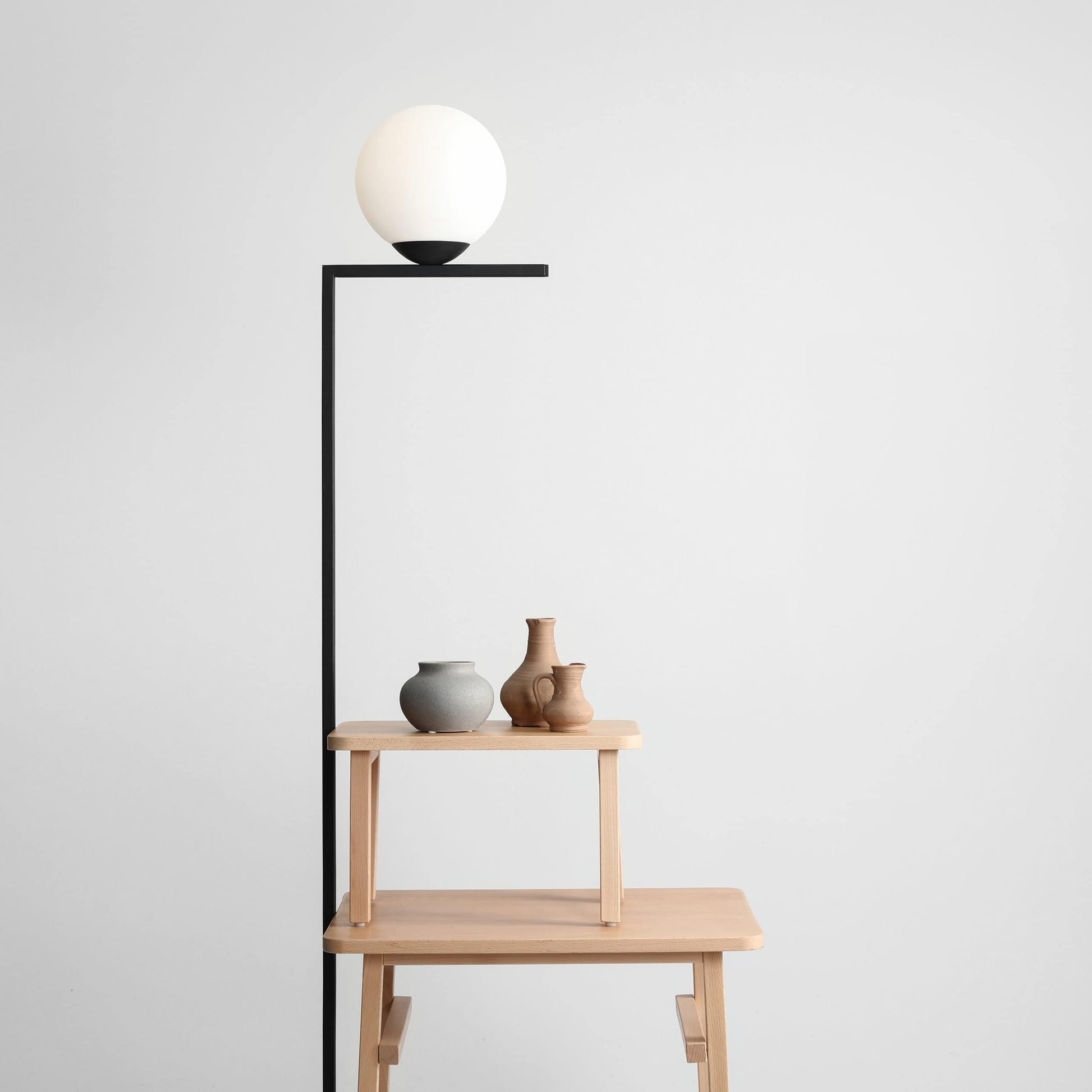 Piantana moderna Zac Floor con paralume sferico opale disposto sul telaio della lampada. Si adatta agli interni in uno stile moderno, come aggiunta atmosferica alla luce principale all'interno.