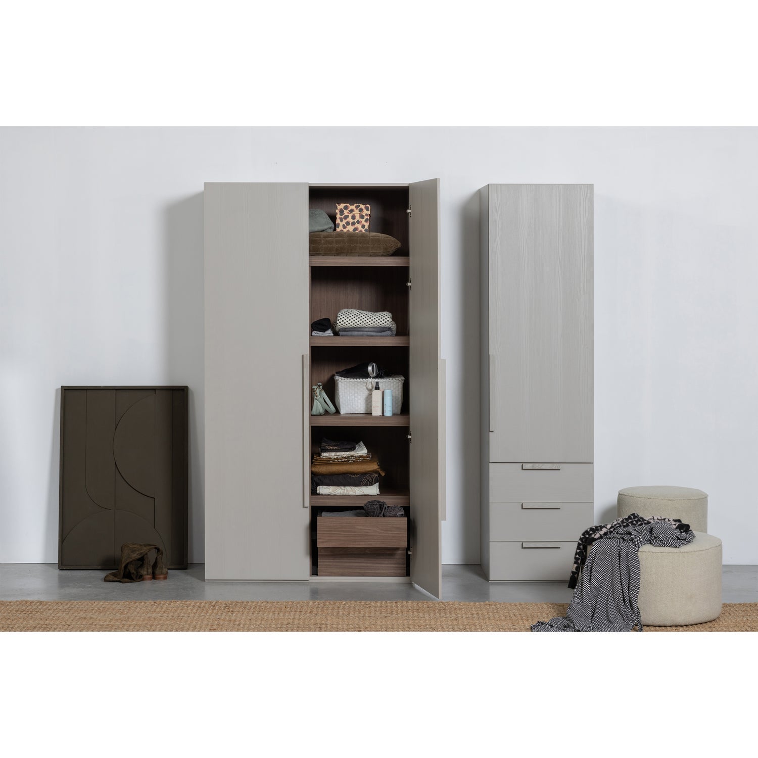 La robusta collezione di armadi Rens del marchio olandese WOOOD è molto adatta a molteplici stili di interni e camere da letto suggestive. L'armadio Rens è dotato di due ante sottili che coprono tutta l'altezza. Le ante nascondono una generosa sezione pensile e quattro spaziosi vani portaoggetti. I due cassetti offrono spazio più che sufficiente per tutti i tipi di vestiti e accessori.
