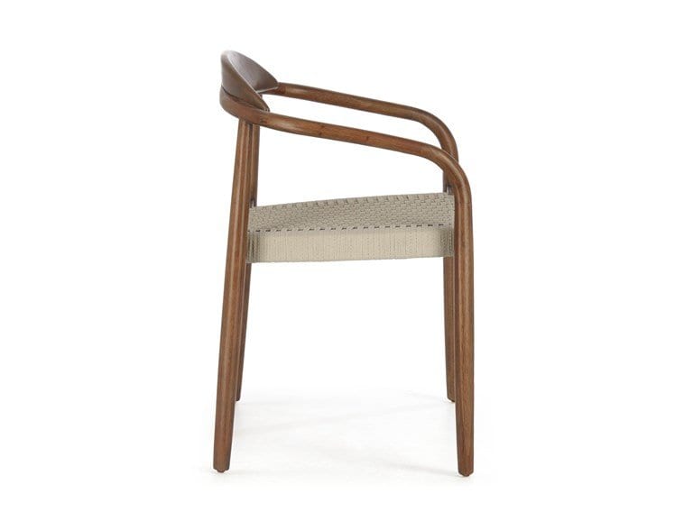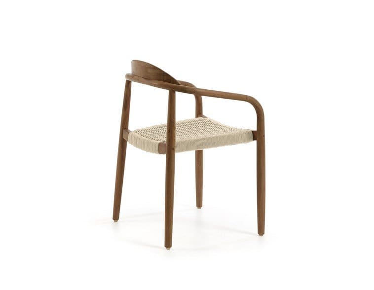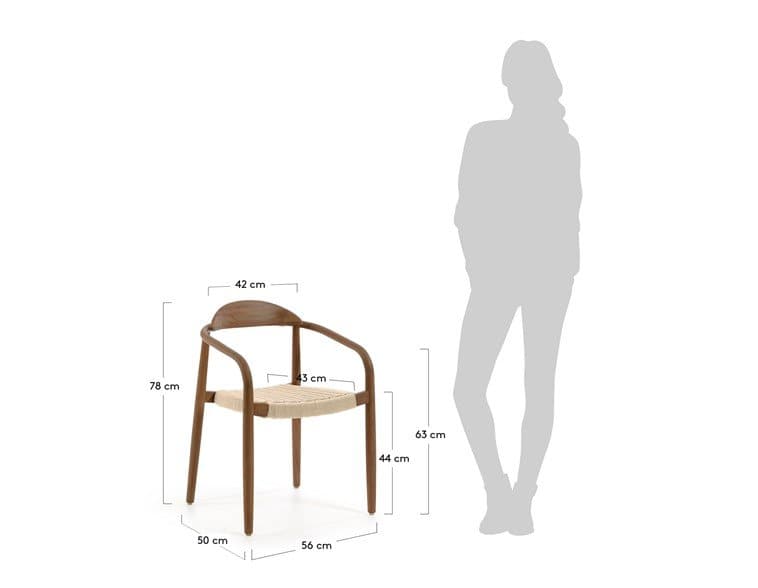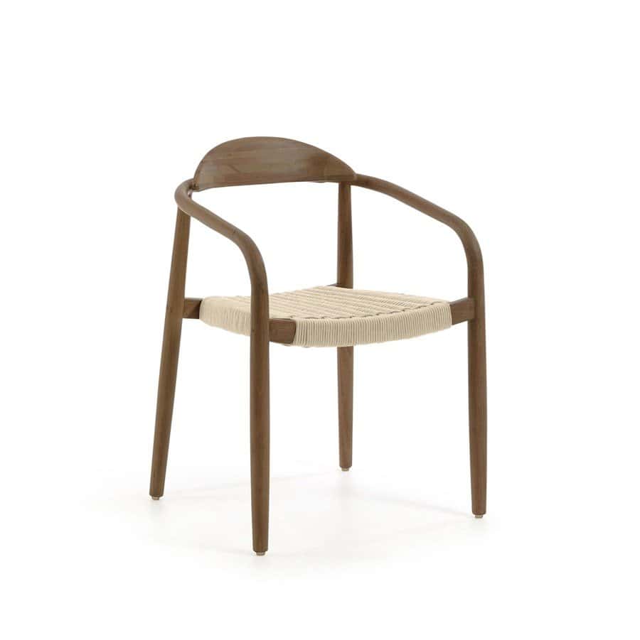 La sedia Nina ha una struttura in legno massello d'eucalipto con finitura noce, laccata con quattro strati per una lunga durata e per proteggerla dai raggi UV. Inoltre, la seduta è intrecciata con corde in poliestere biege che sono resistenti alle intemperie. La tua sedia Nina sarà unica, grazie alle venture naturali del legno massello. Un design e dei materiali autentici adatti per interni con personalità e carattere.