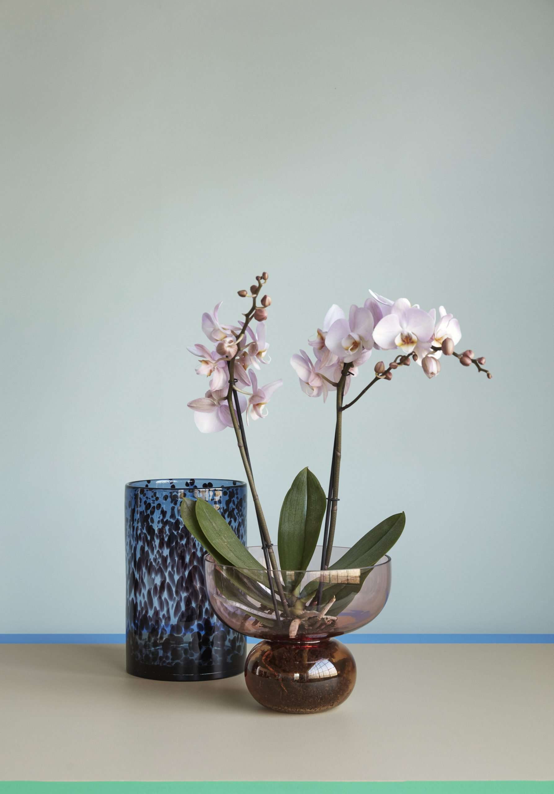 Vase moderne de la marque d'intérieur danoise Hübsch. Ce magnifique vase Hübsch est en verre rose et ambré, avec une forme unique.