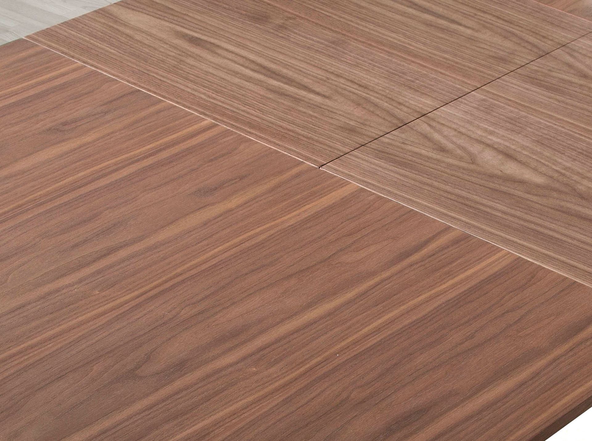Tavolo da pranzo rettangolare allungabile di design moderno con piano e struttura in impiallacciatura di noce naturale. Il suo stile elegante e la sua adattabilità lo rendono un mobile assolutamente funzionale e versatile per l'uso quotidiano.