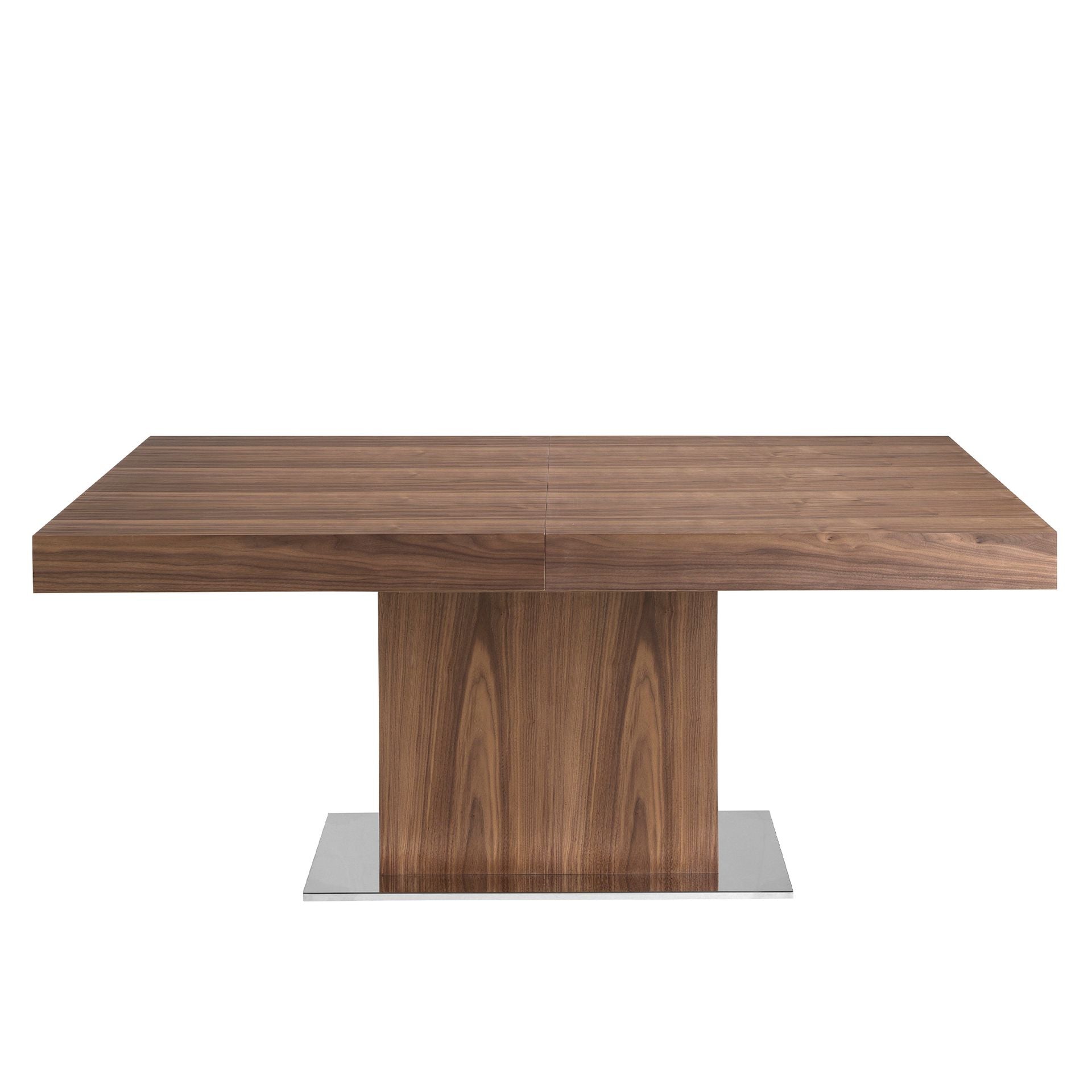 Tavolo da pranzo rettangolare allungabile di design moderno con piano e struttura in legno impiallacciato noce naturale. Questo tavolo con base in acciaio inox cromato, grazie alla sua adattabilità, lo rende un mobile pienamente funzionale e versatile per l'uso quotidiano.