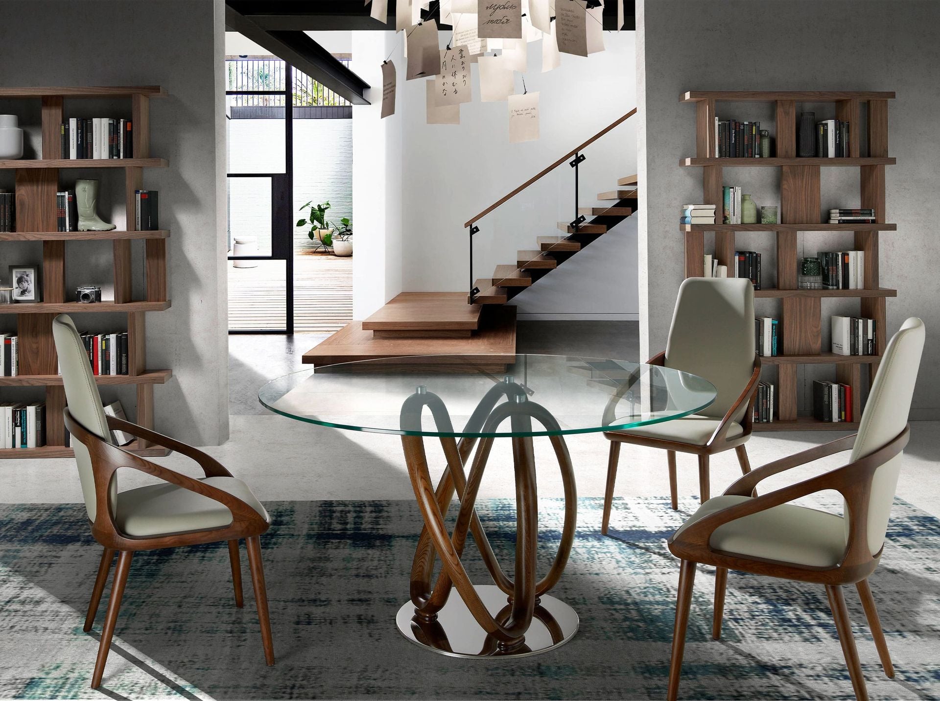 Tavolo da pranzo rotondo moderno con piano fisso in vetro temperato. Le sue originali gambe in legno color noce, insieme alla base in acciaio inox cromato, sono elementi chiave per evidenziare il suo design.