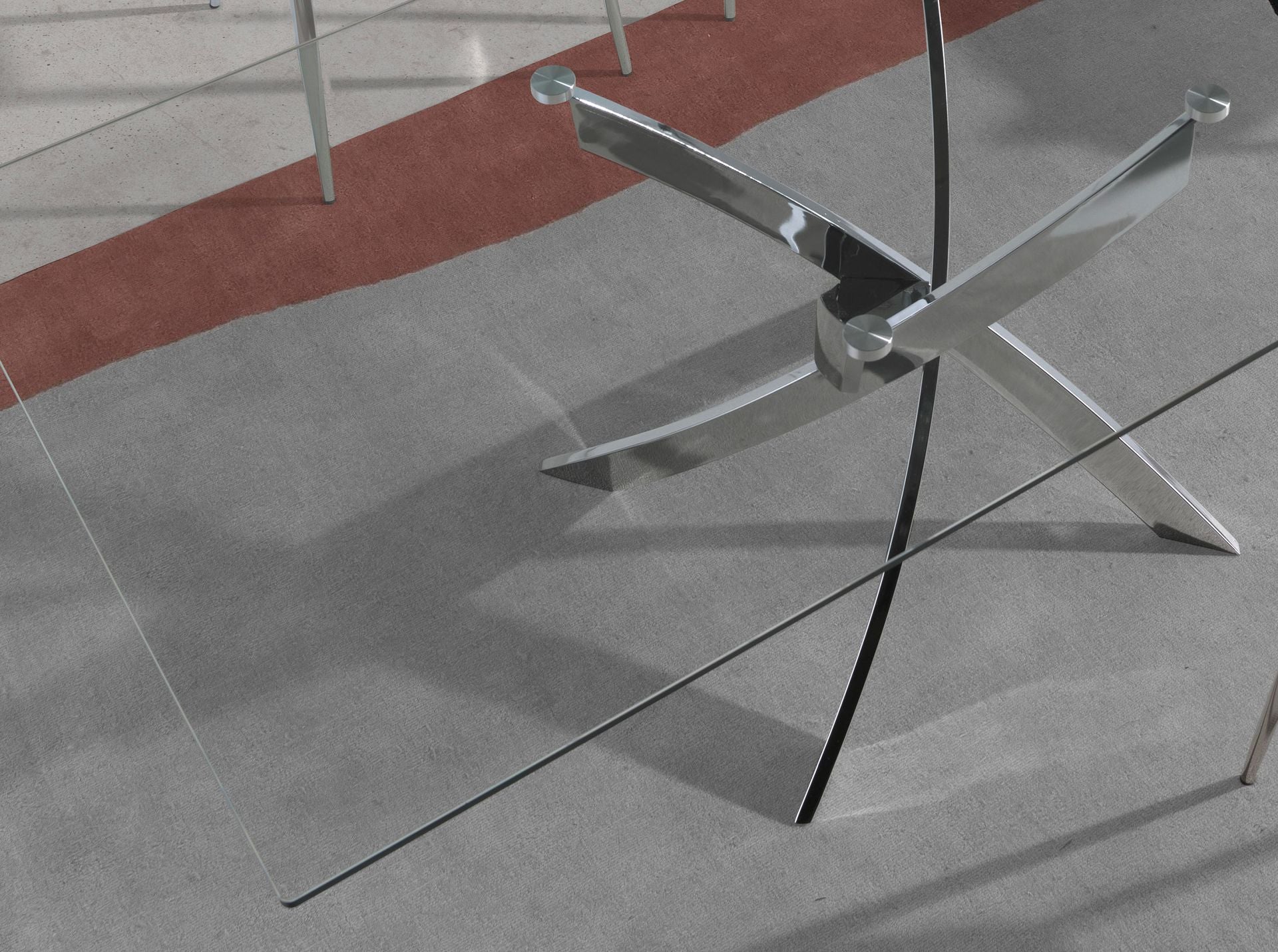 Tavolo da pranzo rettangolare moderno con piano fisso in vetro temperato. Le originali gambe in acciaio inox cromato sono elementi chiave del suo design.