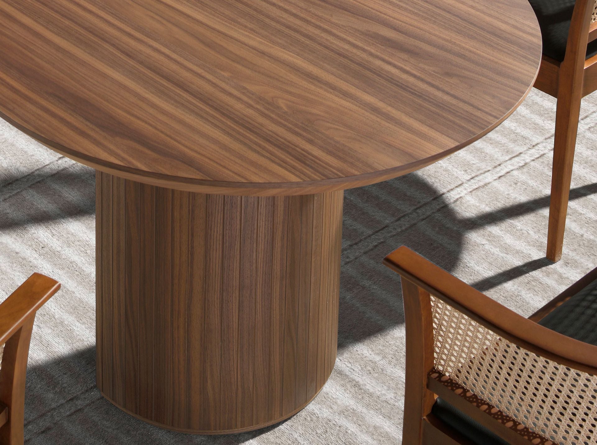 Tavolo da pranzo ovale dal design moderno con piano fisso e struttura in legno impiallacciato in noce naturale. Un tavolo perfetto per dare luce e modernità alla cucina, al soggiorno o alla sala da pranzo.