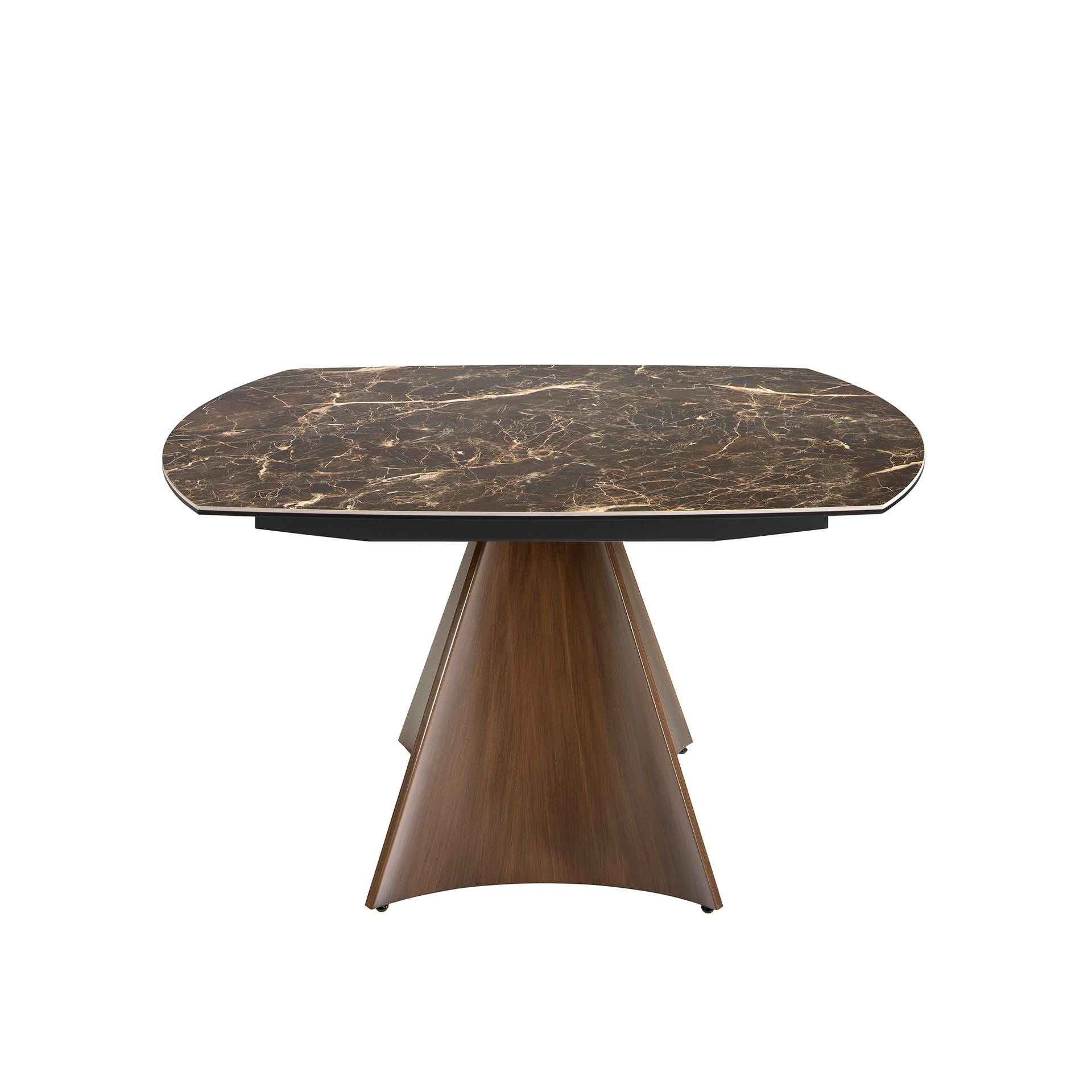 Tavolo da pranzo ovale allungabile a botte dal design moderno con piano in marmo porcellanato marrone con venature crema in finitura lucida. Le sue gambe in acciaio inox laccate in finto legno di noce e la sua adattabilità lo rendono un mobile pienamente funzionale e versatile per l'uso quotidiano.