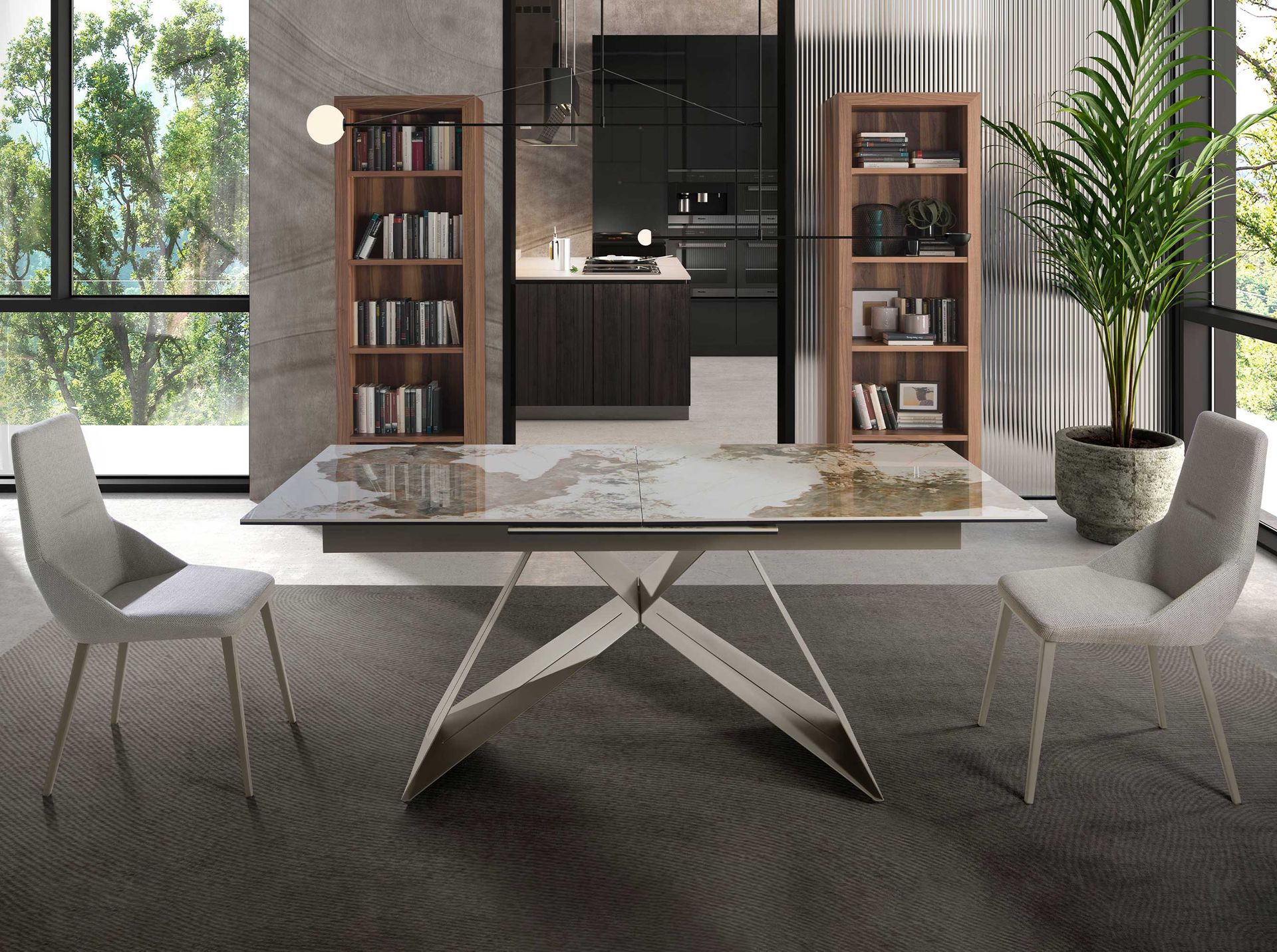 Tavolo da pranzo allungabile rettangolare marmo porcellanato e acciaio color champagne