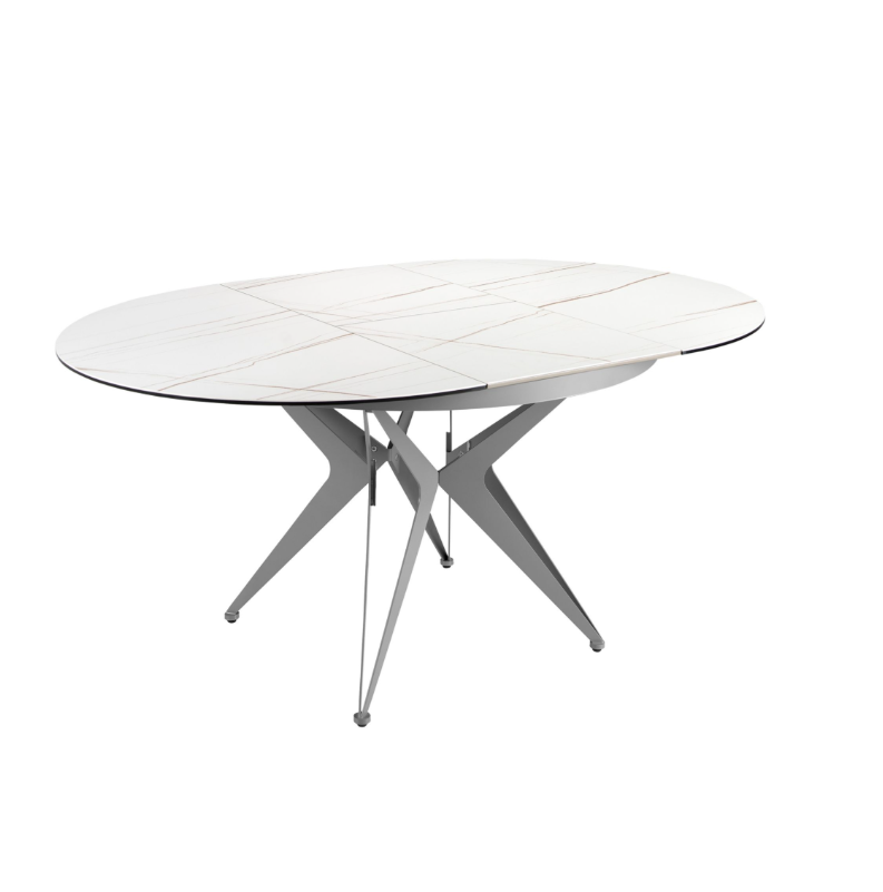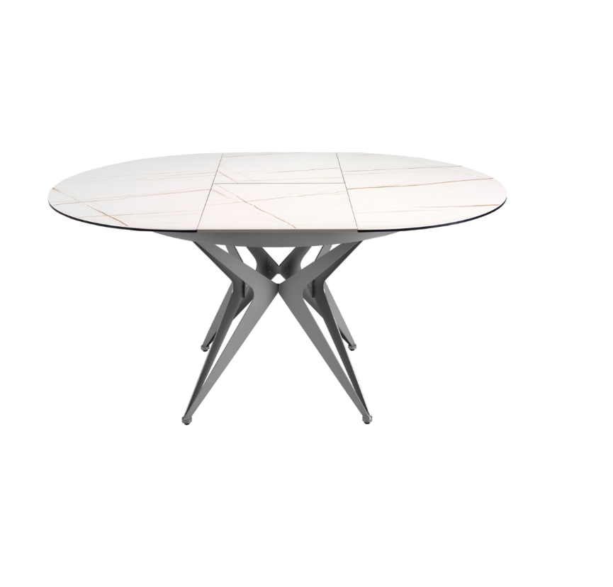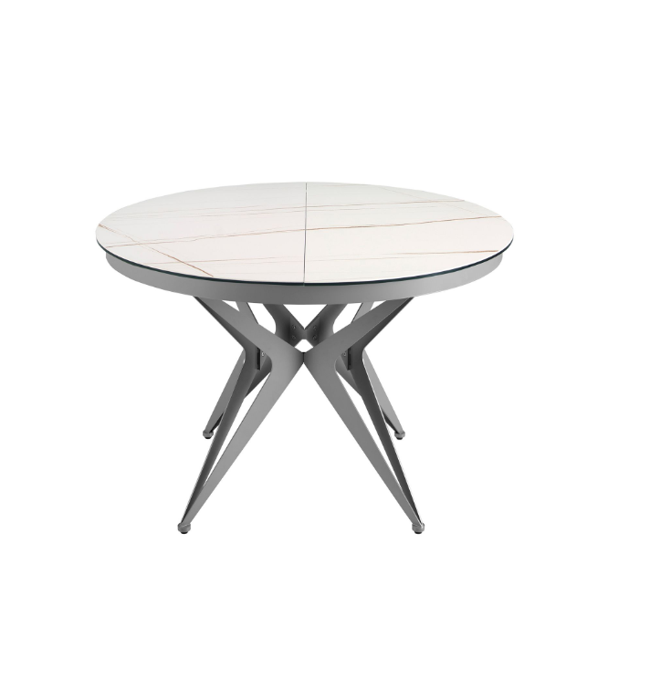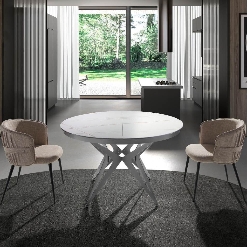 Tavolo da pranzo rotondo allungabile di design moderno con piano in marmo porcellanato bianco con venature marroni in finitura opaca. Le gambe in acciaio inox verniciato color grigio e la sua adattabilità lo rendono un mobile funzionale e versatile per l'uso quotidiano.