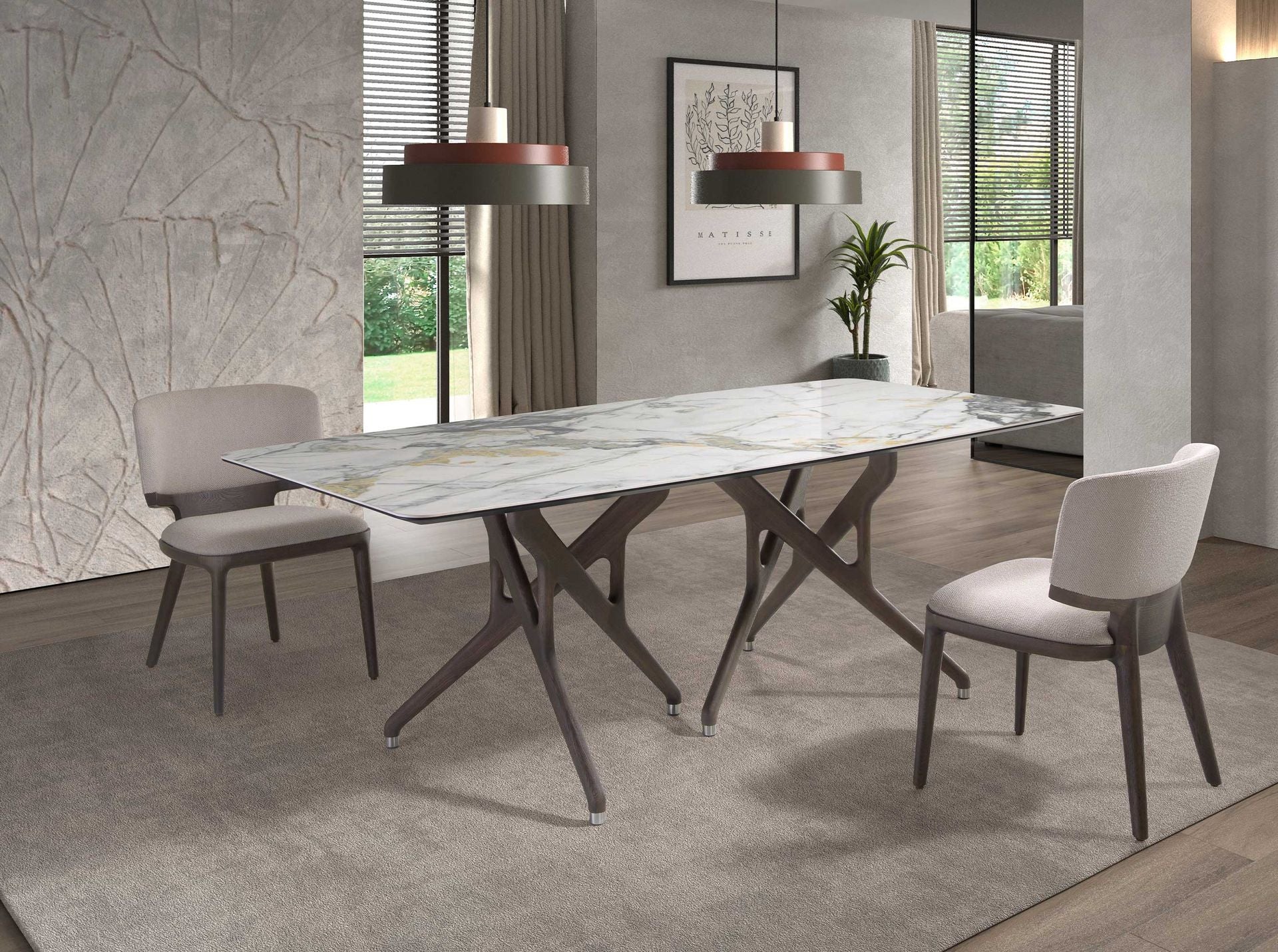 Tavolo da pranzo rettangolare moderno con piano fisso in marmo porcellanato bianco con venature grigie e oro in finitura lucida. Le originali gambe in legno color noce scuro sono elementi chiave del suo design.