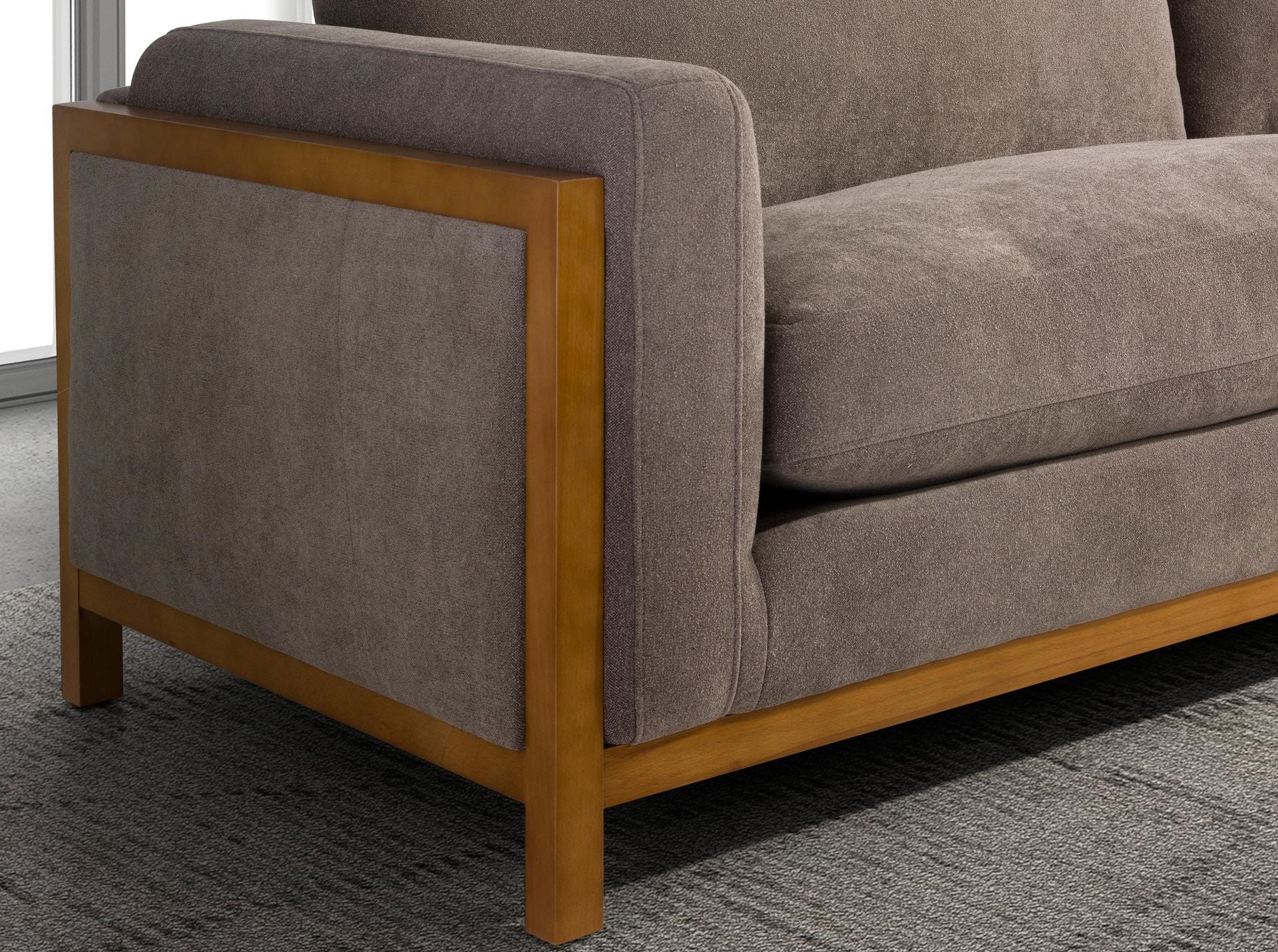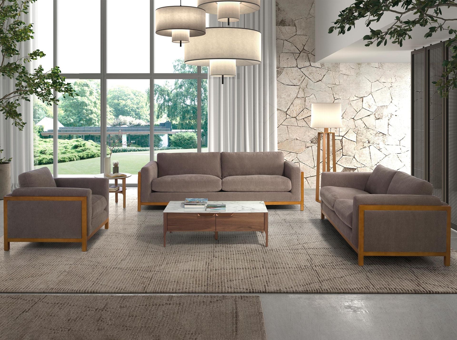 Divano a 3 posti dal design moderno rivestito in tessuto marrone. Sia per il suo stile che per le sue gambe in legno color miele, questo divano porterà il tocco di avanguardia ed eleganza che state cercando nella vostra casa.