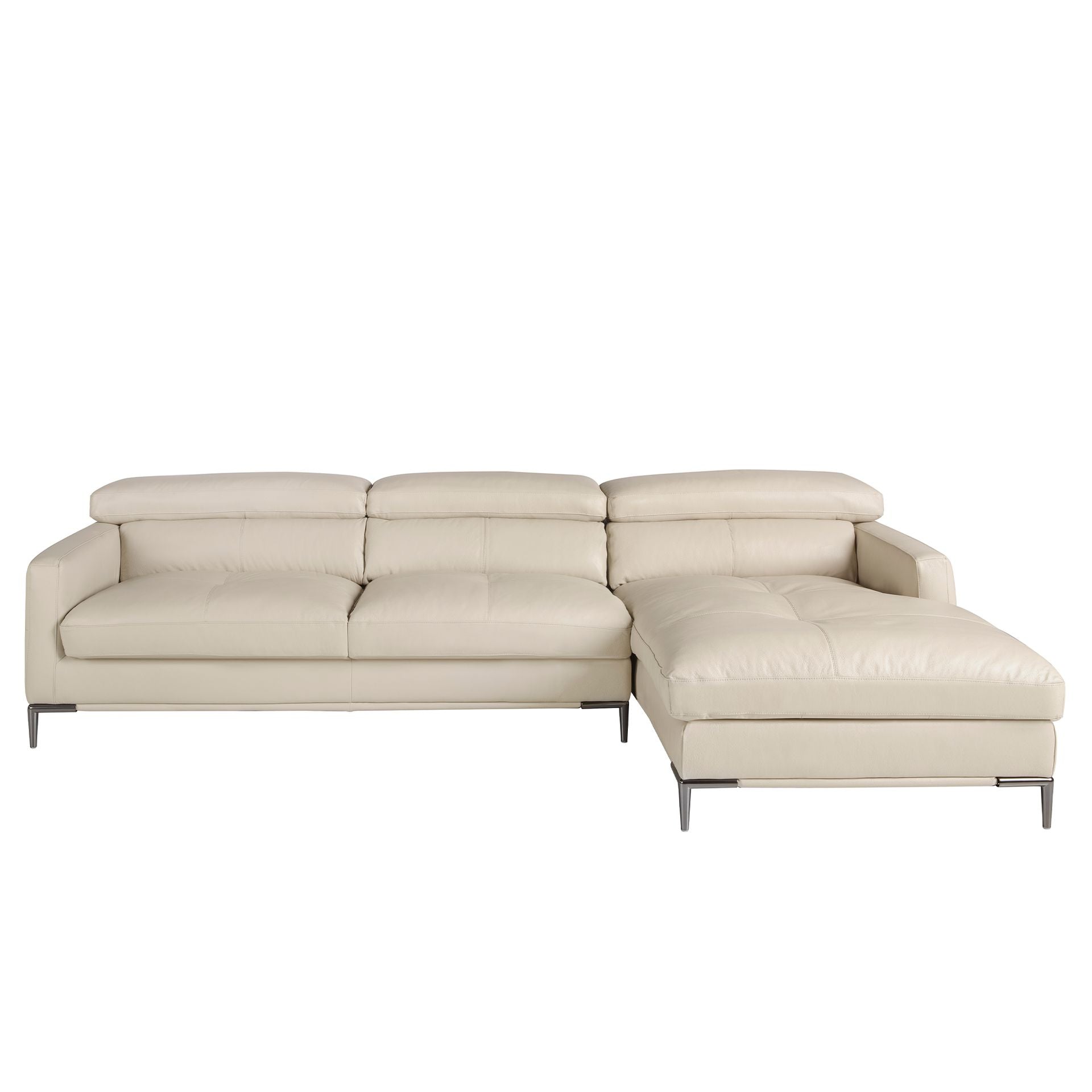 Divano a 5 posti con chaise longue destra dal design moderno, rivestito in pelle di vacchetta sabbia. Sia per il suo stile che per le sue gambe in acciaio inox cromato scuro, questo divano porterà il tocco di avanguardia ed eleganza che state cercando per la vostra casa.